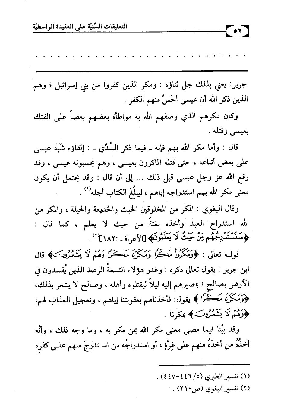 قال: وأما مكر الله بهم فإنَّه -فيما ذكر السُدِّي-: إلقاؤُه شَبَهَ عيسى على بعض أتباعه، حتى قتله الماكرون بعيسى، وهم يحسبونه عيسى، وقد رفع الله عز وجل عيسى قبل ذلك ... إلى أن قال: وقد يحتمل أن يكون معنى مكر الله بهم استدراجه إياهم، ليبلُغَ الكتاب أجله.