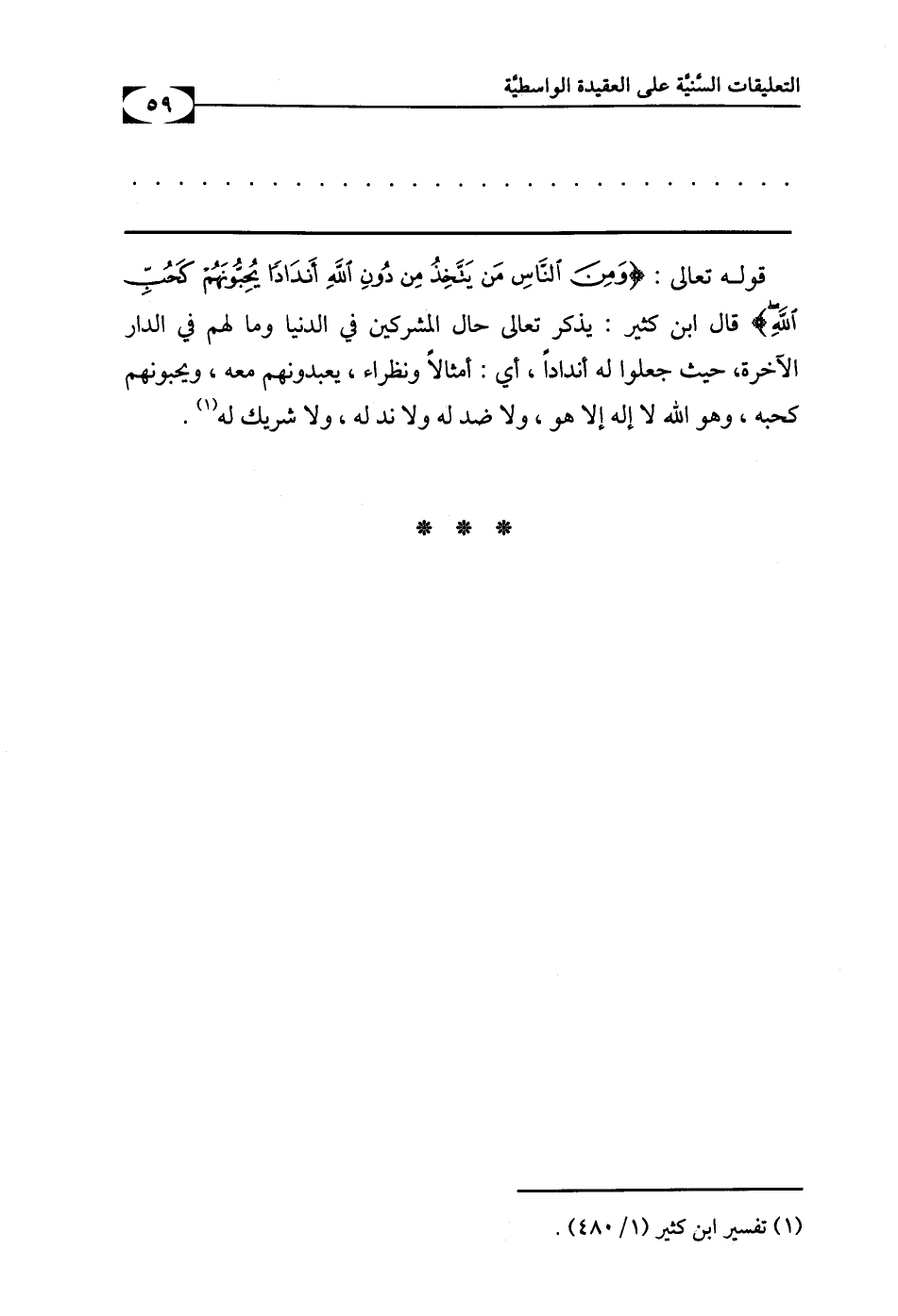 قوله تعالى: {وَمِنَ النَّاسِ مَنْ يَتَّخِذُ مِنْ دُونِ اللَّهِ أَنْدَادًا يُحِبُّونَهُمْ كَحُبِّ اللَّهِ} قال ابن كثير: يذكر تعالى حال المشركين في الدنيا وما لهم في الدار الآخرة، حيث جعلوا له أنداداً، أي: أمثالاً ونظراء، يعبدونهم معه، ويحبونهم كحبه، وهو الله لا إله إلا هو، ولا ضد له ولا ند، ولا شريك له.