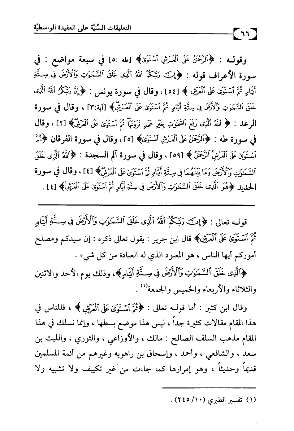 وَقَوْلُهُ: {الرَّحْمَنُ عَلَى الْعَرْشِ اسْتَوَى} [طه: 5] . فِي [سَبْعَةِ] مَوَاضِعَ: فِي سُورَةِ الأَعْرَافِ؛ قَوْلُهُ: {إِنَّ رَبَّكُمُ اللَّهُ الَّذِي خَلَقَ السَّمَاوَاتِ وَالأَرْضَ فِي سِتَّةِ أَيَّامٍ ثُمَّ اسْتَوَى عَلَى الْعَرْشِ} [الأعراف: 54] .