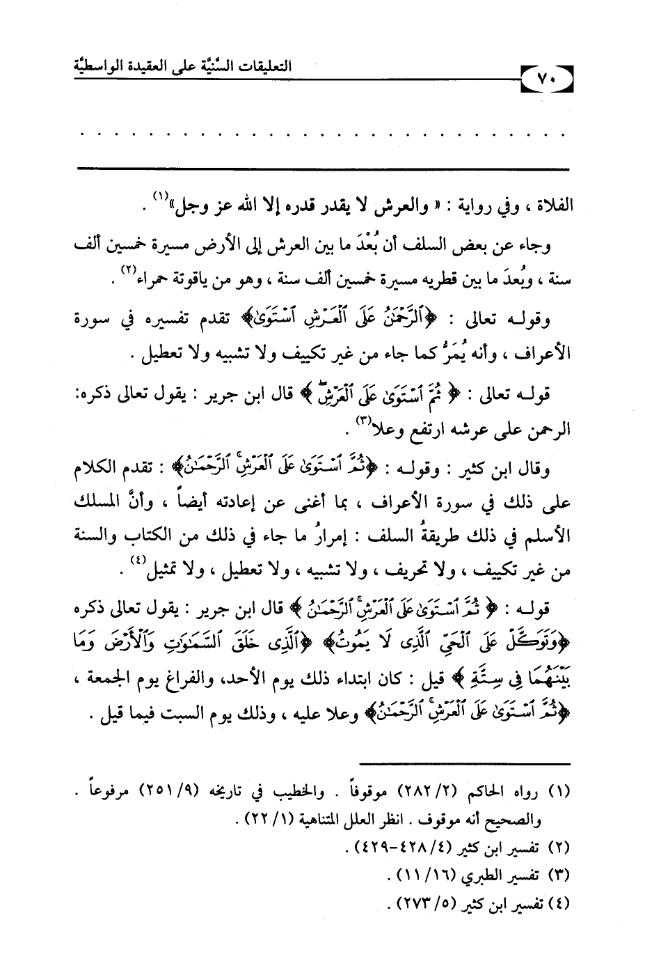 الفلاة"، وفي رواية: "والعرش لا يقدر قدره إلا الله عز وجل ".