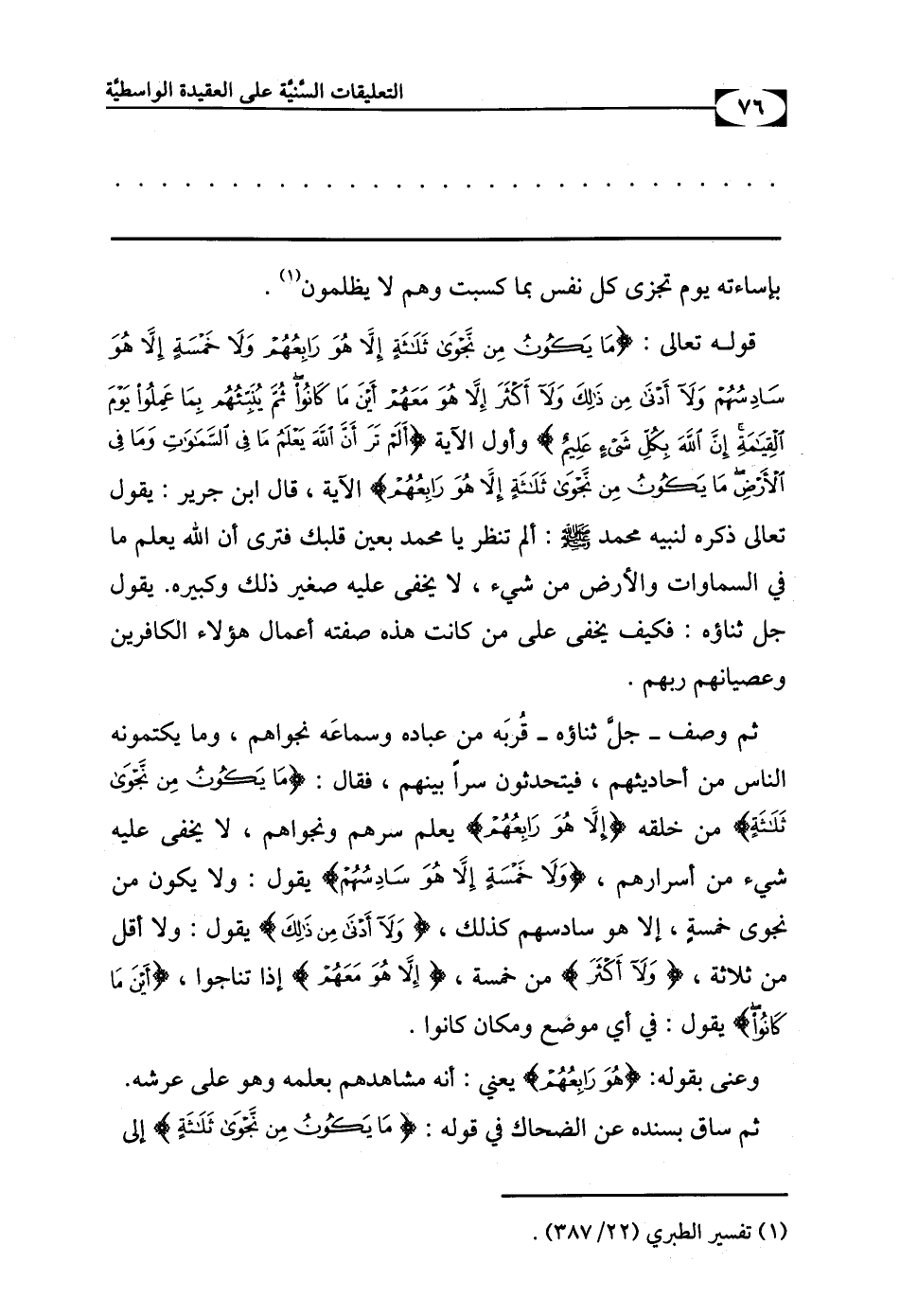قوله تعالى: {مَا يَكُونُ مِنْ نَجْوَى ثَلاثَةٍ إِلا هُوَ رَابِعُهُمْ وَلا خَمْسَةٍ إِلا هُوَ سَادِسُهُمْ وَلا أَدْنَى مِنْ ذَلِكَ وَلا أَكْثَرَ إِلا هُوَ مَعَهُمْ أَيْنَ مَا كَانُوا ثُمَّ يُنَبِّئُهُمْ بِمَا عَمِلُوا يَوْمَ الْقِيَامَةِ إِنَّ اللَّهَ بِكُلِّ شَيْءٍ عَلِيمٌ} وأول الآية {أَلَمْ تَرَ أَنَّ اللَّهَ يَعْلَمُ مَا فِي السَّمَاوَاتِ وَمَا فِي الأرْضِ مَا يَكُونُ مِنْ نَجْوَى ثَلاثَةٍ إِلا هُوَ رَابِعُهُمْ} الآية، قال ابن جرير: يقول تعالى ذكره لنبيه محمد - صلى الله عليه وسلم -: ألم تنظر يا محمد بعين قلبك فترى أن الله يعلم ما في السماوات والأرض من شيء، لا يخفى عليه صغير ذلك وكبيره. يقول جل ثناؤه: فكيف يخفى على من كانت هذه صفته أعمال هؤلاء الكافرين وعصيانهم ربهم.