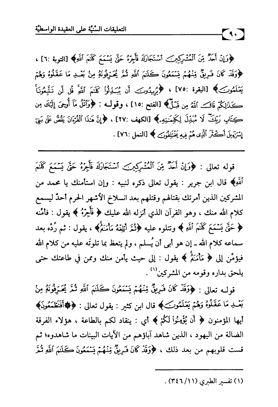 قوله تعالى: {وَإِنْ أَحَدٌ مِنَ الْمُشْرِكِينَ اسْتَجَارَكَ فَأَجِرْهُ حَتَّى يَسْمَعَ كَلامَ اللَّهِ} قال ابن جرير: يقول تعالى ذكره لنبيه: وإن استأمنك يا محمد من المشركين الذين أمرتك بقتالهم وقتلهم بعد انسلاخ الأشهر الحرم أحدٌ ليسمع كلام الله منك، وهو القرآن الذي أنزله الله عليك {فَأَجِرْهُ} يقول: فأمِّنه {حَتَّى يَسْمَعَ كَلامَ اللَّهِ} وتتلوه عليه {ثُمَّ أَبْلِغْهُ مَأْمَنَهُ} يقول: ثم رُدَّه بعد سماعه كلام الله - إن هو أبى أن يُسلم، ولم يتعظ بما تلوتَه عليه من كلام الله فيؤمَّن إلى {مَأْمَنَهُ} يقول: إلى حيث يأمن منك وممن في طاعتك حتى يلحق بداره وقومه من المشركين.