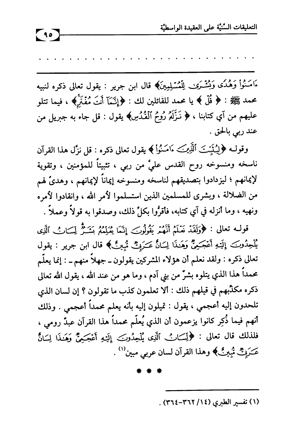 قوله تعالى: {وَلَقَدْ نَعْلَمُ أَنَّهُمْ يَقُولُونَ إِنَّمَا يُعَلِّمُهُ بَشَرٌ لِسَانُ الَّذِي يُلْحِدُونَ إِلَيْهِ أَعْجَمِيٌّ وَهَذَا لِسَانٌ عَرَبِيٌّ مُبِينٌ} قال ابن جرير: يقول تعالى ذكره: ولقد نعلم أن هؤلاء المشركين يقولون - جهلاً منهم -: إنما يعلّم محمداً هذا الذي يتلوه بشرٌ من بني آدم، وما هو من عند الله، يقول الله تعالى ذكره مكذِّبهم في قيلهم ذلك: ألا تعلمون كذب ما تقولون؟ إن لسان الذي تلحدون إليه أعجمي، يقول: تميلون إليه بأنه يعلم محمداً أعجمي. وذلك أنهم فيما ذُكِر كانوا يزعمون أن الذي يُعلّم محمداً هذا القرآن عبدٌ رومي، فلذلك قال تعالى: {لِسَانُ الَّذِي يُلْحِدُونَ إِلَيْهِ أَعْجَمِيٌّ وَهَذَا لِسَانٌ عَرَبِيٌّ مُبِينٌ} وهذا القرآن لسانٌ عربيٌ مبين.