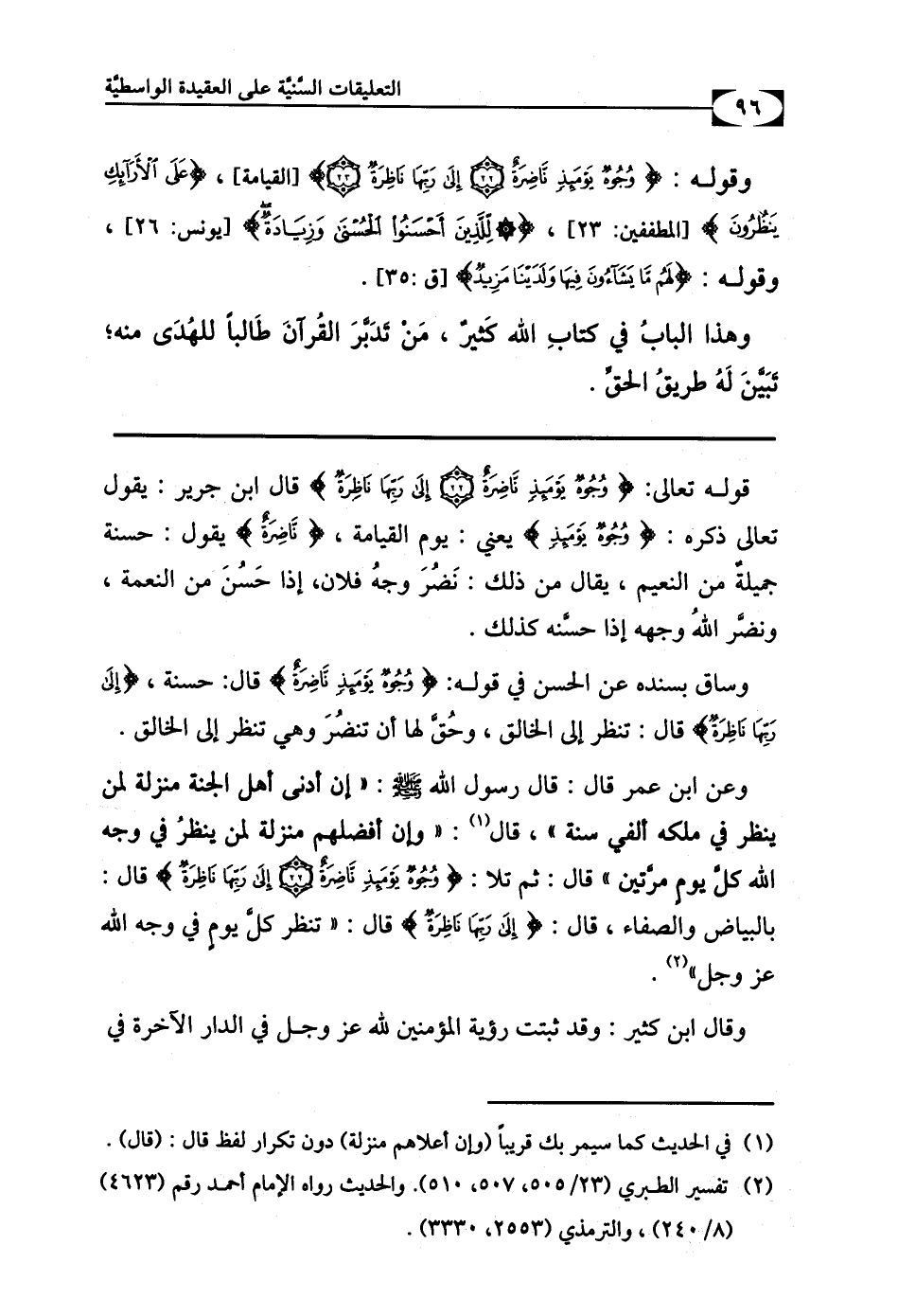 قوله تعالى: {وُجُوهٌ يَوْمَئِذٍ نَاضِرَةٌ * إِلَى رَبِّهَا نَاظِرَةٌ} قال ابن جرير: يقول تعالى ذكره: {وُجُوهٌ يَوْمَئِذٍ} يعني: يوم القيامة، {نَاضِرَةٌ} يقول: حسنة جميلةٌ من النعيم، يقال من ذلك: نَضُرَ وجهُ فلان، إذا حَسُنَ من النعمة، ونضَّر اللهُ وجهه إذا حسَّنه كذلك.