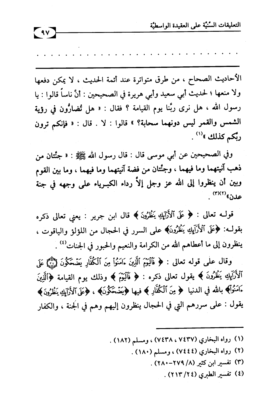 الأحاديث من طرق متواترة عند أئمة الحديث، لا يمكن دفعها ولا منعها؛ لحديث أبي سعيد وأبي هريرة في الصحيحين: أنَّ ناساً قالوا: يا رسول الله، هل نرى ربَّنا يوم القيامة؟ فقال: "هل تُضارُّون في رؤية الشمس والقمر ليس دونهما سحابة؟ " قالوا: لا. قال: "فإنَّكم ترون ربكم كذلك ".