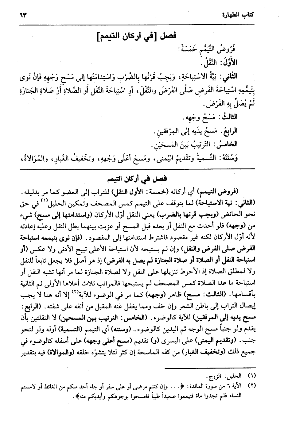 "فروض التيمم" أي أركانه "خمسة: الأول النقل" للتراب إلى العضو كما مر بدليله "الثاني: نية الاستباحة" لم يتوقف على التيمم كمس المصحف وتمكين الحليل1 في حق نحو الحائض "ويجب قرنها بالضرب" يعني النقل أول الأركان "واستدامتها إلى مسح" شيء من "وجهه" فلو أحدث مع النقل أو بعده قبل المسح أو عزبت بينهما بطل النقل وعليه إعادته لأنه أول الأركان لكنه غير مقصود فاشترط استدامتها إلى المقصود. "فإن نوى بتيممه استباحة الفرض صلى الفرض والنفل" وإن لم يستبحه لأن استباحة الأعلى تبيح الأدنى ولا عكس "أو استباحة النفل أو الصلاة أو صلاة الجنازة لم يصل به الفرض" إذ هو أصل فلا يجعل تابعًا للنفل ولا لمطلق الصلاة إذ الأحوط بتنزيلها على النفل ولا لصلاة الجنازة لما مر أنها تشبه النفل أو استباحة ما عدا الصلاة كمس المصحف لم يستبحها فالمراتب ثلاث أعلاها الأولى ثم الثانية بأقسامها. "الثالث: مسح" ظاهر "وجهه" كما مر في الوضوء للآية2 إلا أنه هنا لا يجب إيصال التراب إلى باطن الشعر وإن خف ومما يغفل عنه المقبل من أنفه على شفته. "الرابع: مسح يديه إلى المرفقين" للآية كالوضوء. "الخامس: الترتيب بين المسحين" لا النقلتين بأن يقدم ولو جنبًا مسح الوجه ثم اليدين كالوضوء. "وسننه" أي التيمم "التسمية" أوله ولو لنحو جنب. "وتقديم اليمنى" على اليسرى "و" تقديم "مسح أعلى وجهه" على أسفله كالوضوء في جميع ذلك "وتخفيف الغبار" من كفه الماسحة إن كثر لئلا يتشوه خلقه "والموالاة" فيه بتقدير