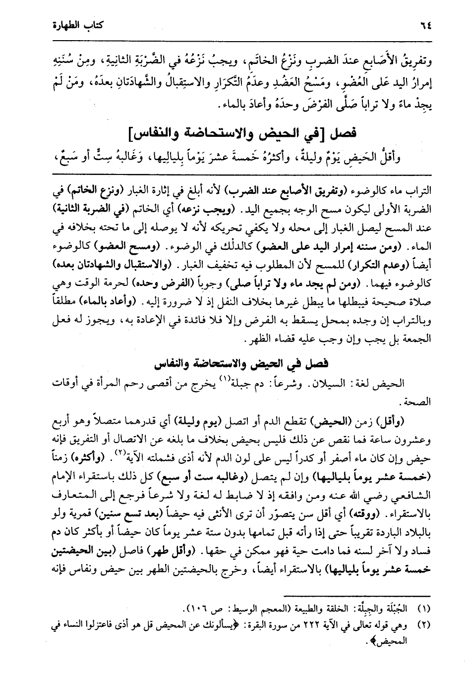 "وأقل" زمن "الحيض" تقطع الدم أو اتصل "يوم وليلة" أي قدرهما متصلًا وهو أربع وعشرون ساعة فما نقص عن ذلك فليس بحيض بخلاف ما بلغه عن الاتصال أو التفريق فإنه حيض وإن كان ماء أصفر أو كدرًا ليس على لون الدم لأنه أذى فشملته الآية2. "وأكثره" زمنًا "خمسة عشر يومًا بلياليها" وإن لم يتصل "وغالبه ست أو سبع" كل ذلك باستقراء الإمام الشافعي رضي الله عنه ومن وافقه إذ لا ضابط له لغة ولا شرعًا فرجع إلى المتعارف بالاستقراء، "ووقته" أي أقل سنة يتصور أن ترى الأنثى فيه حيضًا "بعد تسع سنين" قمرية ولو بالبلاد الباردة تقريبًا حتى إذا رأته قبل تمامها بدون ستة عشر يومًا كان حيضًا أو بأكثر كان دم فساد ولا آخر لسنه فما دامت حية فهو ممكن في حقها. "وأقل طهر" فاصل "بين الحيضتين خمسة عشر يومًا بلياليها" بالاستقراء أيضًا، وخرج بالحيضتين الطهر بين حيض ونفاس فإنه