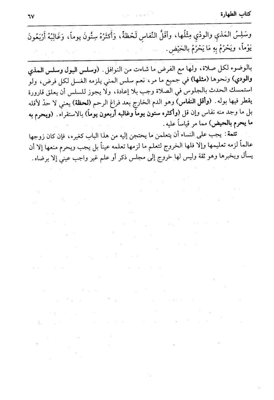 تتمة: يجب على النساء أن يتعلمن ما يحتجن إليه من هذا الباب كغيره، فإن كان زوجها عالمًا لزمه تعليمها وإلا فلها الخروج ما لزمها تعلمه عينًا بل يجب ويحرم منعها إلا أن يسأل ويخبرها وهو ثقة وليس لها خروج إلى مجلس ذكر أو علم غير واجب عيني إلا برضاه.