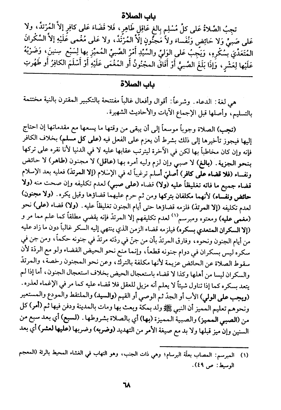 تجب الصلاة على كل مسلم بالغ عاقل طاهر، فلا قضاء على كافر إلا المرتد، ولا على صبي ولا حائض ونفساء ولا مجنون إلا المرتد، ولا على مغمى عليه إلا السكران المتعدي بسكره، ويجب على الولي والسيد أمر الصبي المميز بها لسبع سنين، وضربه عليها لعشر، وإذا بلغ الصبي أو أفاق المجنون أو المغمى عليه أو أسلم الكافر أو طهرت