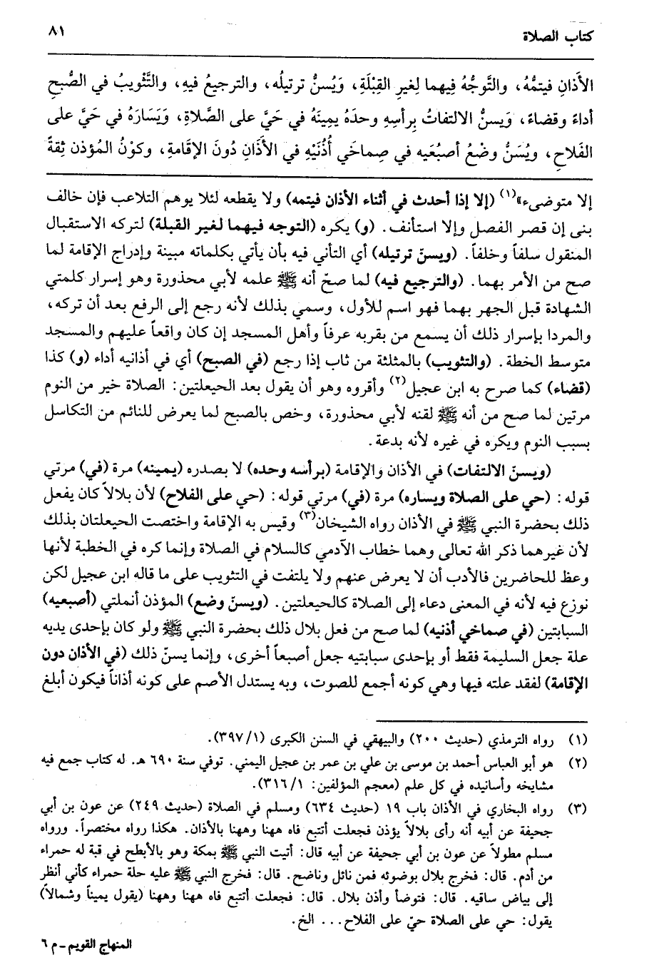"ويسن الالتفات" في الأذان والإقامة "برأسه وحده" لا بصدره "يمينه" مرة "في" مرتي قوله: "حي على الصلاة ويساره" مرة "في" مرتي قوله: "حي على الفلاح" لأن بلالا كان يفعل ذلك بحضرة النبي صلى الله عليه وسلم في الأذان رواه الشيخان3 وقيس به الإقامة واختصت الحيعلتان بذلك لأن غيرهما ذكر الله تعالى وهما خطاب الآدمي كالسلام في الصلاة وإنما كره في الخطبة لأنها وعظ للحاضرين فالأدب أن لا يعرض عنهم ولا يلتفت في التثويب على ما قاله ابن عجيل لكن نوزع فيه لأنه في المعنى دعاء إلى الصلاة كالحيعلتين. "ويسن وضع" المؤذن أنملتي "أصبعيه" السبابتين "في صماخي أذنيه" لما صح من فعل بلال ذلك بحضرة النبي صلى الله عليه وسلم ولو كان بإحدى يديه علة يجعل السليمة فقط أو بإحدى سبابتيه جعل أصبعًا أخرى، وإنما يسن ذلك "في الأذان دون الإقامة" لفقد علته فيها وهي كونه أجمع للصوت، وبه يستدل الأصم على كونه أذانًا فيكون أبلغ