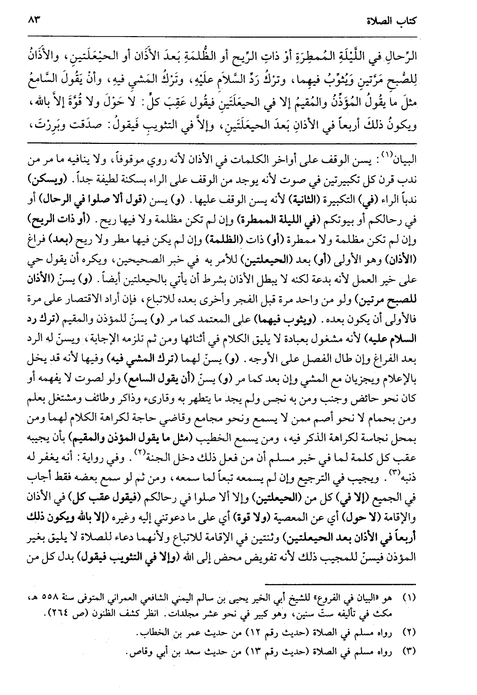 الرحال في الليلة الممطرة أو ذات الريح أو الظلمة بعد الأذان أو الحيعلتين، والأذان للصبح مرتين ويثوب فيهما، وترك رد السلام عليه، وترك المشي فيه، وأن يقول السامع مثل ما يقول المؤذن والمقيم إلا في الحيعلتين فيقول عقب كل: لا حول ولا قوة إلا بالله، ويكون ذلك أربعًا في الأذان بعد الحيعلتين، وإلا في التثويب فيقول: صدقت وبررت،