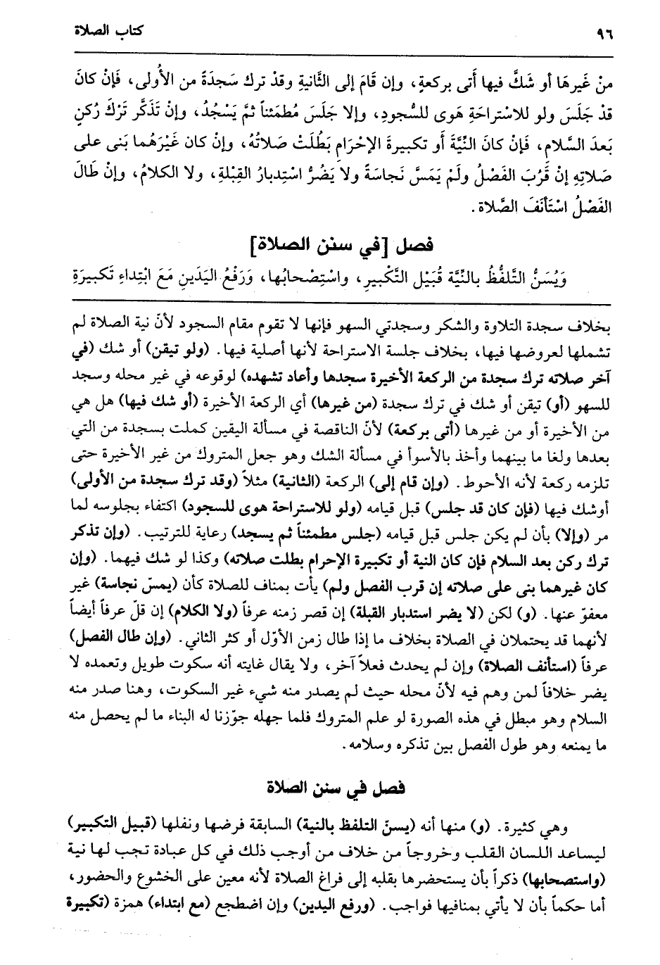 بخلاف سجدة التلاوة والشكر وسجدتي السهو فإنها لا تقوم السجود لأن نية الصلاة لم تشملها لعروضها فيها، بخلاف جلسة الاستراحة لأنها أصلية فيها، "ولو تيقن" أو شك "في آخر صلاته ترك سجدة من الركعة الأخيرة سجدها وأعاد تشهده" لوقوعه في غير محله وسجد للسهو "أو" تيقن أو شك في ترك سجدة "من غيرها" أي الركعة الأخيرة "أو شك فيها" هل هي من الأخيرة أو من غيرها "أتى بركعة" لأن الناقصة في مسألة اليقين كملت بسجدة من التي بعدها ولغا ما بينهما وأخذ بالأسوأ في مسألة الشك وهو جعل المتروك من غير الأخيرة حتى تلزمه ركعة لأنه الأحوط. "وإن قام إلى" الركعة "الثانية" مثلًا "وقد ترك سجدة من الأولى" أو شك فيها "فإن كان قد جلس" قبل قيامه "ولو للاستراحة هوى للسجود" اكتفاء بجلوسه لما مر "وإلا" بأن لم يكن جلس قبل قيامه "جلس مطمئنًا ثم يسجد" رعاية للترتيب. "وإن تذكر ترك ركن بعد السلام فإن كان النية أو تكبيرة الإحرام بطلت صلاته" وكذا لو شك فيهما. "وإن كان غيرهما بنى على صلاته إن قرب الفصل ولم" يأت بمناف للصلاة كأن "يمس نجاسة" غير معفو عنها. "و" لكن "لا يضر استدبار القبلة" إن قصر زمنه عرفًا "ولا الكلام" إن قل عرفًا أيضًا لأنهما قد يحتملان في الصلاة بخلاف ما إذا طال زمن الأول أو كثر الثاني. "وإن طال الفصل" عرفًا "استأنفت الصلاة" وإن لم يحدث فعلًا آخر، ولا يقال غايته أنه سكوت طويل وتعمده لا يضر خلافًا لمن وهم فيه لأن محله حيث لم يصدر منه شيء غير السكوت، وهنا صدر منه السلام وهو مبطل في هذه الصورة لو علم المتروك فلما جهله جوزنا له البناء ما لم يحصل منه ما يمنعه وهو طول الفصل بين تذكره وسلامه.