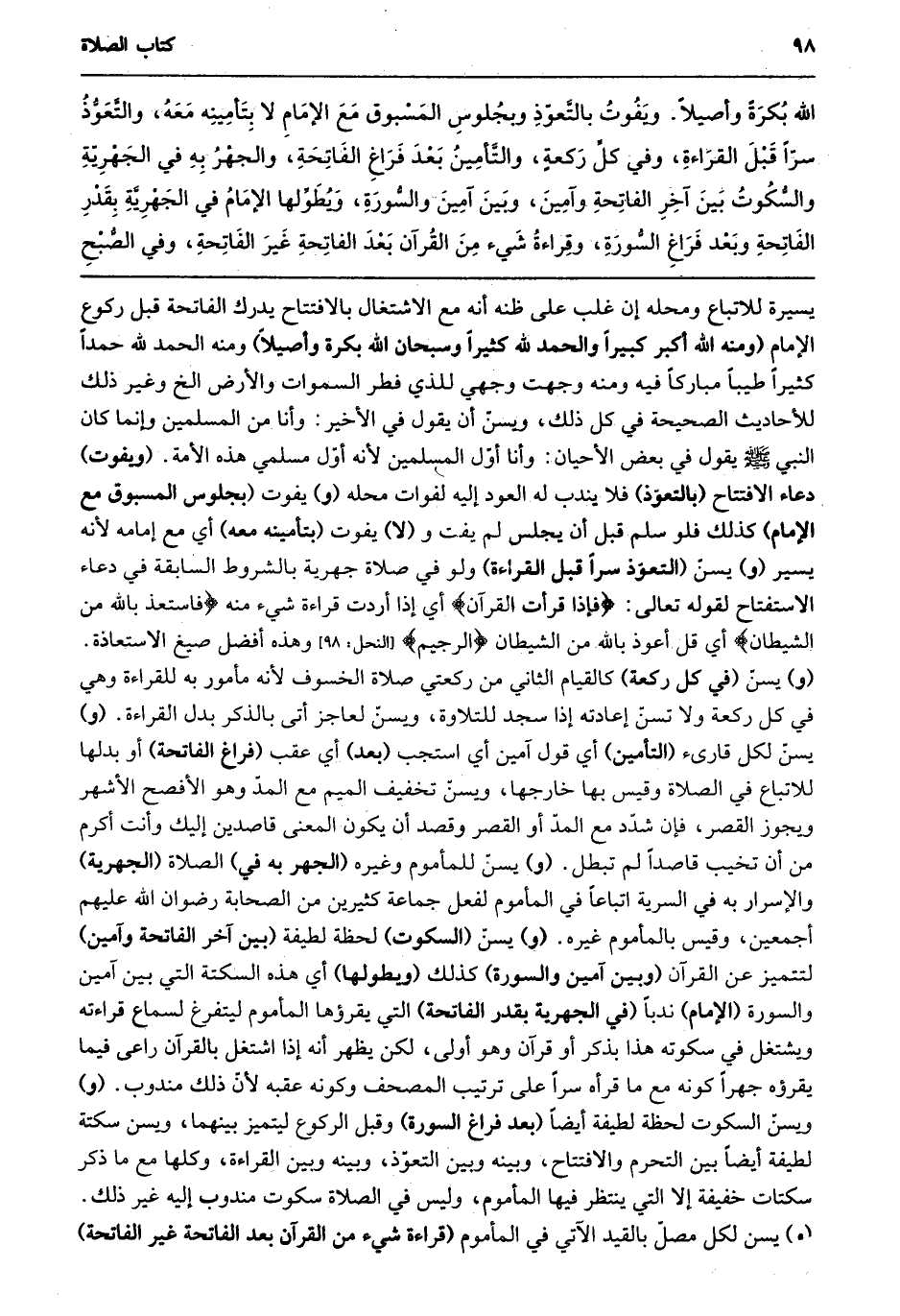 الله بكرة وأصيلًا. ويفوت بالتعوذ وبجلوس المسبوق مع الإمام لا بتأمينه معه، والتعوذ سرًا قبل القراءة، وفي كل ركعة، والتأمين بعد فراغ الفاتحة، والجهر به في الجهرية والسكوت بين آخر الفاتحة وآمين، وبين آمين والسورة، ويطولها الإمام في الجهرية بقدر الفاتحة وبعد فراغ السورة، وقراءة شيء من القرآن بعد الفاتحة غير الفاتحة، وفي الصبح