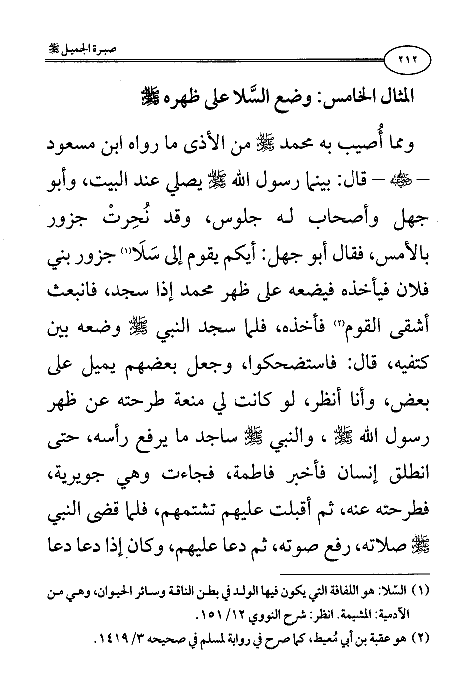 المثال الخامس: وضع السَّلا على ظهره صلى الله عليه وسلم: ومما أُصيب به محمد صلى الله عليه وسلم من الأذى ما رواه ابن مسعود - رضي الله عنه - قال: «بينما رسول الله صلى الله عليه وسلم يصلي عند البيت، وأبو جهل وأصحاب له جلوس، وقد نُحِرتْ جزور بالأمس، فقال أبو جهل: أيكم يقوم إلى سَلَا (¬1) جزور بني فلان فيأخذه فيضعه على ظهر محمد إذا سجد، فانبعث أشقى القوم (¬2) فأخذه، فلما سجد النبي صلى الله عليه وسلم وضعه بين كتفيه، قال: فاستضحكوا، وجعل بعضهم يميل على بعض، وأنا أنظر، لو كانت لي منعة طرحته عن ظهر رسول الله صلى الله عليه وسلم، والنبي صلى الله عليه وسلم ساجد ما يرفع رأسه، حتى انطلق إنسان فأخبر فاطمة، فجاءت وهي جويرية، فطرحته عنه، ثم أقبلت عليهم تشتمهم، فلما قضى النبي صلى الله عليه وسلم صلاته، رفع صوته، ثم دعا عليهم، وكان إذا دعا دعا