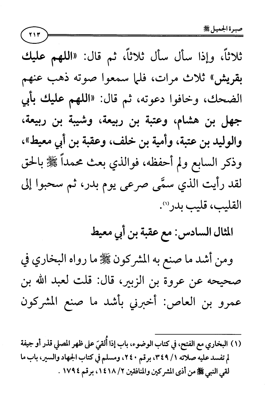 (¬1) البخاري مع الفتح، في كتاب الوضوء، باب إذا أُلقيَ على ظهر المصلي قذر أو جيفة لم تفسد عليه صلاته 1/ 349، برقم 240، ومسلم في كتاب الجهاد والسير، باب ما لقي النبي - صلى الله عليه وسلم - من أذى المشركين والمنافقين 2/ 1418، برقم 1794.