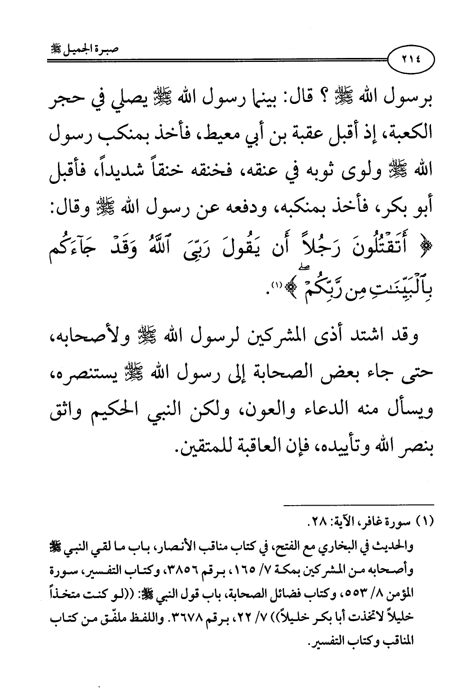 برسول الله صلى الله عليه وسلم؟ قال: بينما رسول الله صلى الله عليه وسلم يصلي في حجر الكعبة، إذ أقبل عقبة بن أبي معيط، فأخذ بمنكب رسول الله صلى الله عليه وسلم ولوى ثوبه في عنقه، فخنقه خنقًا شديدًا، فأقبل أبو بكر، فأخذ بمنكبه، ودفعه عن رسول الله صلى الله عليه وسلم وقال: {أَتَقْتُلُونَ رَجُلًا أَنْ يَقُولَ رَبِّيَ اللَّهُ وَقَدْ جَاءَكُمْ بِالْبَيِّنَاتِ مِنْ رَبِّكُمْ} [غافر: 28]»
