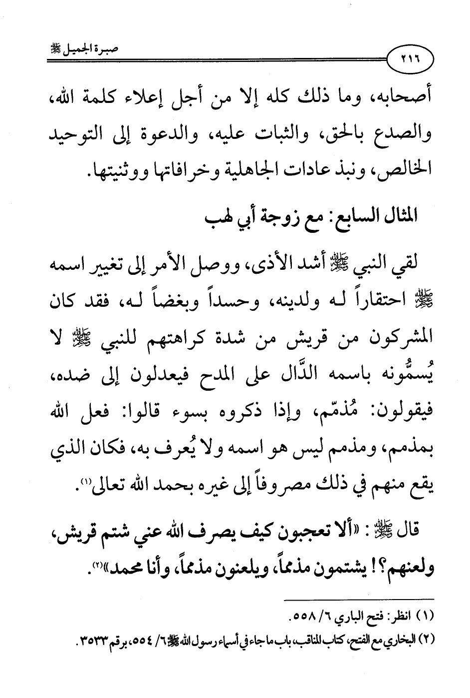 المثال السابع: مع زوجة أبي لهب: لقي النبي صلى الله عليه وسلم أشد الأذى، ووصل الأمر إلى تغيير اسمه صلى الله عليه وسلم احتقارًا له ولدينه، وحسدًا وبغضًا له، فقد كان المشركون من قريش من شدة كراهتهم للنبي صلى الله عليه وسلم لا يُسمُّونه باسمه الدَّال على المدح فيعدلون إلى ضده، فيقولون: مُذمَّم، وإذا ذكروه بسوء قالوا: فعل الله بمذمم، ومذمم ليس هو اسمه ولا يُعرف به، فكان الذي يقع منهم في ذلك مصروفًا إلى غيره بحمد الله تعالى (¬1).
