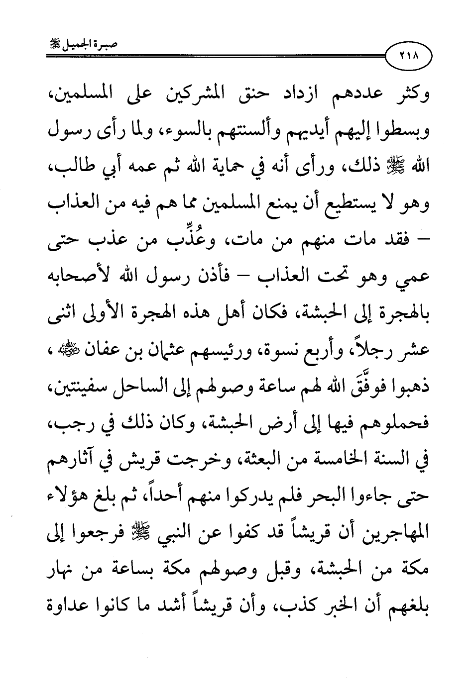 وكثر عددهم ازداد حنق المشركين على المسلمين، وبسطوا إليهم أيديهم وألسنتهم بالسوء، ولما رأى رسول الله صلى الله عليه وسلم ذلك، ورأى أنه في حماية الله ثم عمه أبي طالب، وهو لا يستطيع أن يمنع المسلمين مما هم فيه من العذاب - فقد مات منهم من مات، وعُذِّب من عذب حتى عمي وهو تحت العذاب - فأذن رسول الله لأصحابه بالهجرة إلى الحبشة، فكان أهل هذه الهجرة الأولى اثنى عشر رجلًا، وأربع نسوة، ورئيسهم عثمان بن عفان رضي الله عنه، ذهبوا فوفَّقَ الله لهم ساعة وصولهم إلى الساحل سفينتين، فحملوهم فيها إلى أرض الحبشة، وكان ذلك في رجب، في السنة الخامسة من البعثة، وخرجت قريش في آثارهم حتى جاءوا البحر فلم يدركوا منهم أحدًا، ثم بلغ هؤلاء المهاجرين أن قريشًا قد كفوا عن النبي صلى الله عليه وسلم فرجعوا إلى مكة من الحبشة، وقبل وصولهم مكة بساعة من نهار بلغهم أن الخبر كذب، وأن قريشًا أشد ما كانوا عداوة