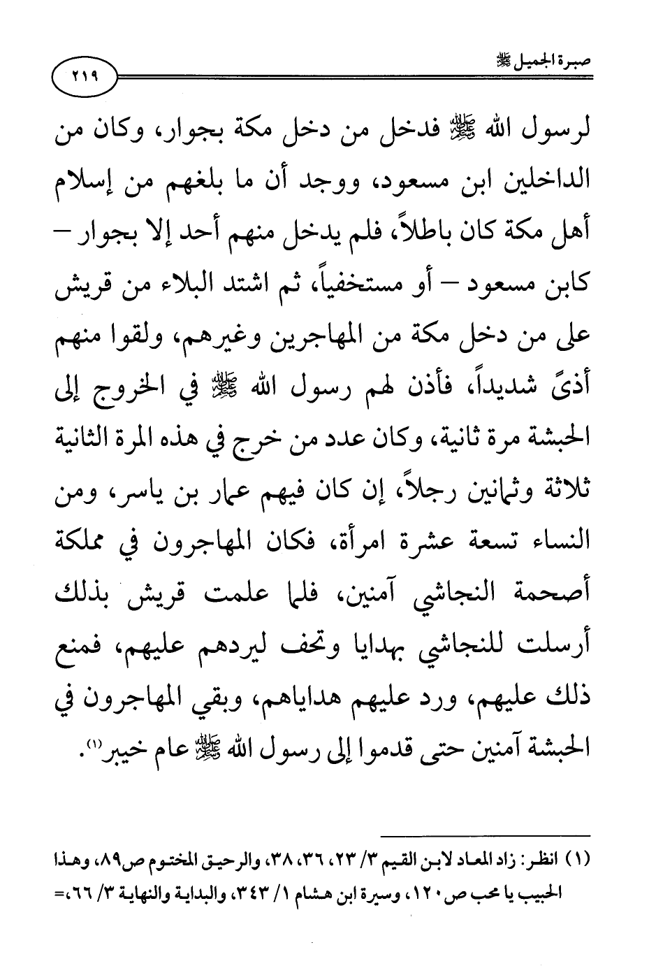 لرسول الله صلى الله عليه وسلم فدخل من دخل مكة بجوار، وكان من الداخلين ابن مسعود، ووجد أن ما بلغهم من إسلام أهل مكة كان باطلًا، فلم يدخل منهم أحد إلا بجوار - كابن مسعود - أو مستخفيًا، ثم اشتد البلاء من قريش على من دخل مكة من المهاجرين وغيرهم، ولقوا منهم أذىً شديدًا، فأذن لهم رسول الله صلى الله عليه وسلم في الخروج إلى الحبشة مرة ثانية، وكان عدد من خرج في هذه المرة الثانية ثلاثة وثمانين رجلًا، إن كان فيهم عمار بن ياسر، ومن النساء تسعة عشرة امرأة، فكان المهاجرون في مملكة أصحمة النجاشي آمنين، فلما علمت قريش بذلك أرسلت للنجاشي بهدايا وتحف ليردهم عليهم، فمنع ذلك عليهم، ورد عليهم هداياهم، وبقي المهاجرون في الحبشة آمنين حتى قدموا إلى رسول الله صلى الله عليه وسلم عام خيبر (¬1).