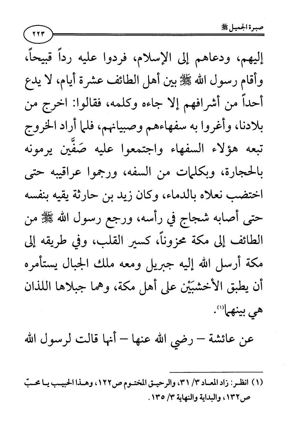 إليهم، ودعاهم إلى الإسلام، فردوا عليه ردًا قبيحًا، وأقام رسول الله صلى الله عليه وسلم بين أهل الطائف عشرة أيام، لا يدع أحدًا من أشرافهم إلا جاءه وكلمه، فقالوا: اخرج من بلادنا، وأغروا به سفهاءهم وصبيانهم، فلما أراد الخروج تبعه هؤلاء السفهاء واجتمعوا عليه صَفَّين يرمونه بالحجارة، وبكلمات من السفه، ورجموا عراقيبه حتى اختضب نعلاه بالدماء، وكان زيد بن حارثة يقيه بنفسه حتى أصابه شجاج في رأسه، ورجع رسول الله صلى الله عليه وسلم من الطائف إلى مكة محزونًا، كسير القلب، وفي طريقه إلى مكة أرسل الله إليه جبريل ومعه ملك الجبال يستأمره أن يطبق الأخشبَيْن على أهل مكة، وهما جبلاها اللذان هي بينهما (¬1).
