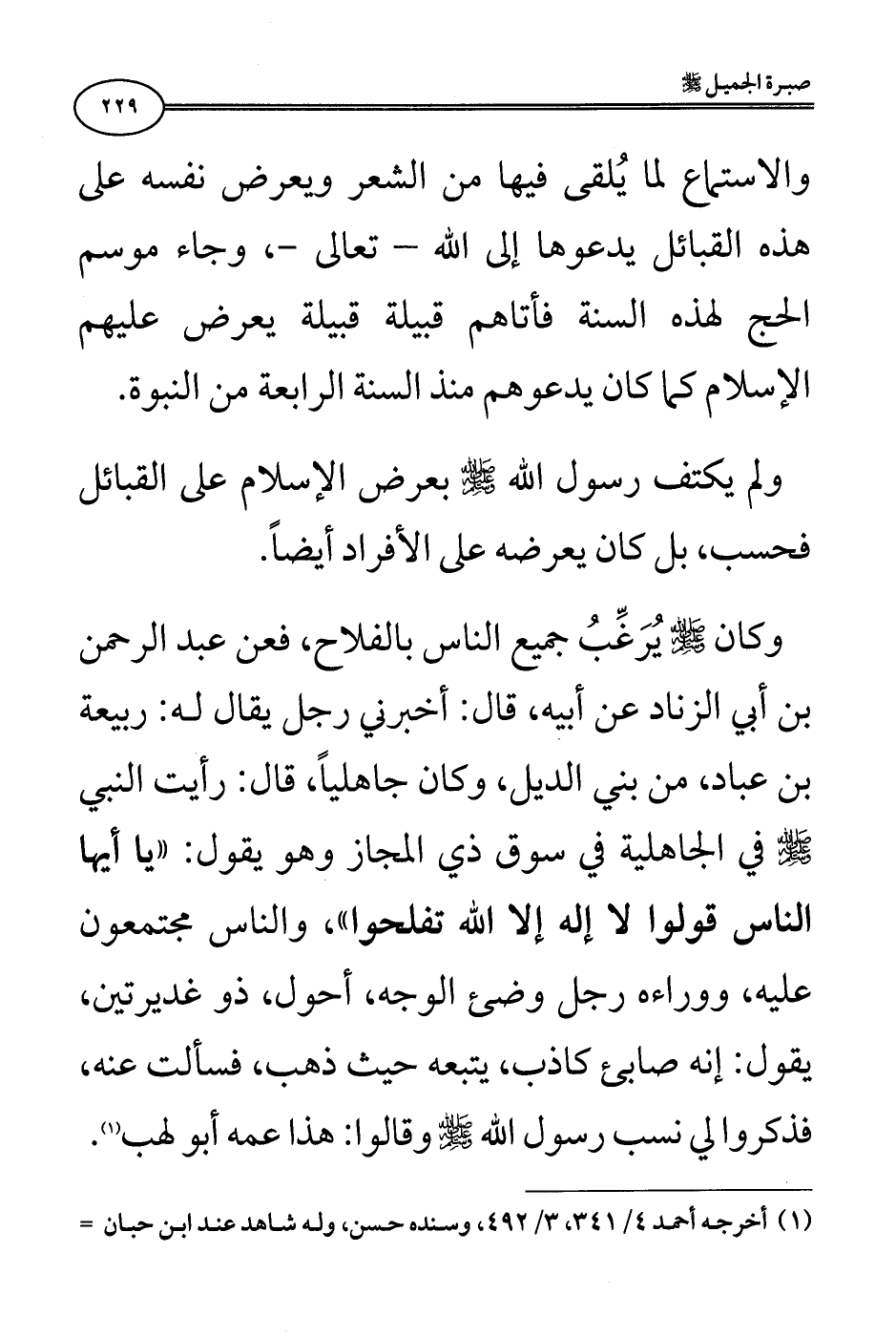 وكان صلى الله عليه وسلم يُرَغِّبُ جميع الناس بالفلاح، فعن عبد الرحمن بن أبي الزناد عن أبيه، قال: أخبرني رجل يقال له: ربيعة بن عباد، من بني الديل، وكان جاهليًا، قال: «رأيت النبي صلى الله عليه وسلم في الجاهلية في سوق ذي المجاز وهو يقول: "يا أيها الناس قولوا لا إله إلا الله تفلحوا"، والناس مجتمعون عليه، ووراءه رجل وضئ الوجه، أحول، ذو غديرتين، يقول: إنه صابئ كاذب، يتبعه حيث ذهب، فسألت عنه، فذكروا لي نسب رسول الله صلى الله عليه وسلم وقالوا: هذا عمه أبو لهب» (¬1).