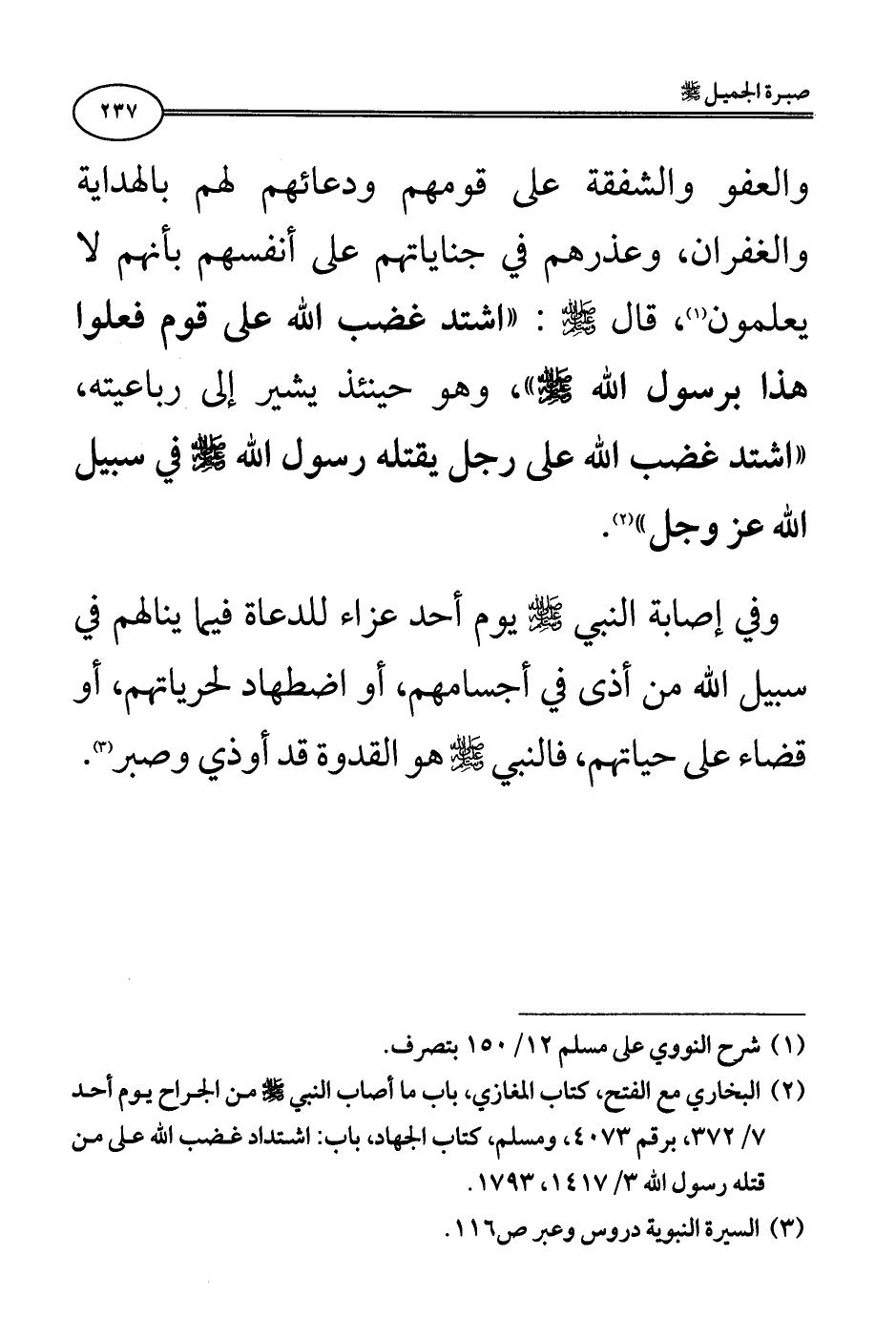 (¬2) البخاري مع الفتح، كتاب المغازي، باب ما أصاب النبي - صلى الله عليه وسلم - من الجراح يوم أحد 7/ 372، برقم 4073، ومسلم، كتاب الجهاد، باب: اشتداد غضب الله على من قتله رسول الله 3/ 1417، 1793.