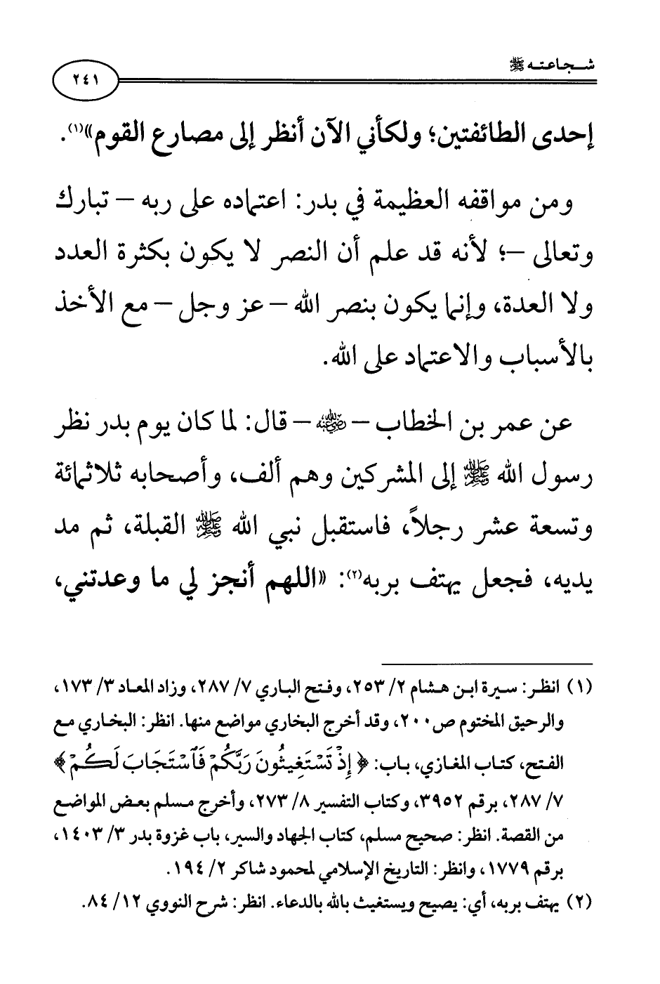 (¬1) انظر: سيرة ابن هشام 2/ 253، وفتح الباري 7/ 287، وزاد المعاد 3/ 173، والرحيق المختوم ص200، وقد أخرج البخاري مواضع منها. انظر: البخاري مع الفتح، كتاب المغازي، باب: {إِذْ تَسْتَغِيثُونَ رَبَّكُمْ فَاسْتَجَابَ لَكُمْ} 7/ 287، برقم 3952، وكتاب التفسير 8/ 273، وأخرج مسلم بعض المواضع من القصة. انظر: صحيح مسلم، كتاب الجهاد والسير، باب غزوة بدر 3/ 1403، برقم 1779، وانظر: التاريخ الإسلامي لمحمود شاكر 2/ 194.
