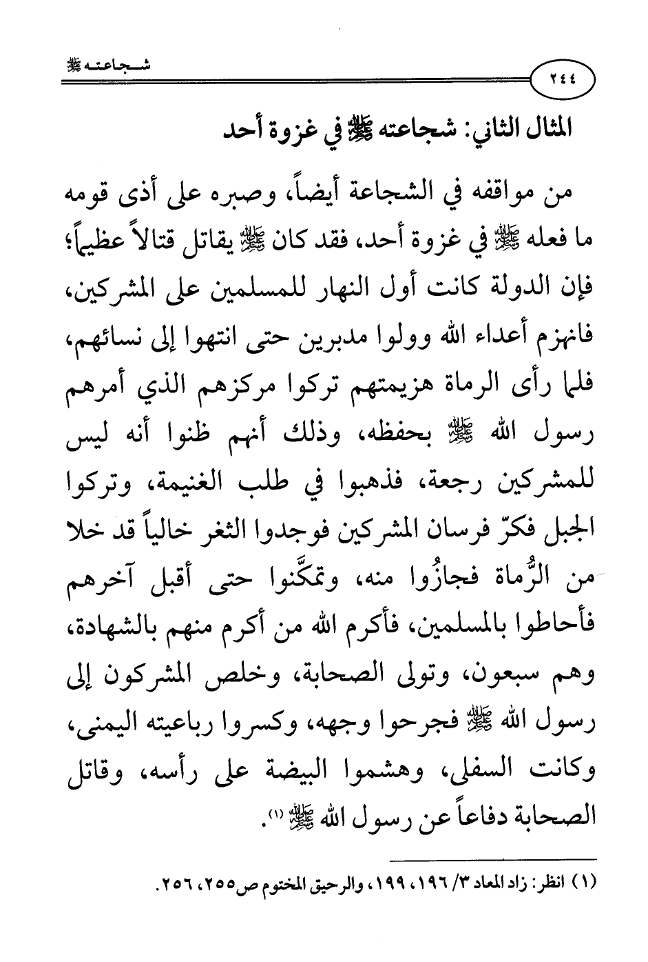 المثال الثاني: شجاعته صلى الله عليه وسلم في غزوة أحد: من مواقفه في الشجاعة أيضًا، وصبره على أذى قومه ما فعله صلى الله عليه وسلم في غزوة أحد، فقد كان صلى الله عليه وسلم يقاتل قتالًا عظيمًا؛ فإن الدولة كانت أول النهار للمسلمين على المشركين، فانهزم أعداء الله وولوا مدبرين حتى انتهوا إلى نسائهم، فلما رأى الرماة هزيمتهم تركوا مركزهم الذي أمرهم رسول الله صلى الله عليه وسلم بحفظه، وذلك أنهم ظنوا أنه ليس للمشركين رجعة، فذهبوا في طلب الغنيمة، وتركوا الجبل فكرَّ فرسان المشركين فوجدوا الثغر خاليًا قد خلا من الرُّماة فجازُوا منه، وتمكَّنوا حتى أقبل آخرهم فأحاطوا بالمسلمين، فأكرم الله من أكرم منهم بالشهادة، وهم سبعون، وتولى الصحابة، وخلص المشركون إلى رسول الله صلى الله عليه وسلم فجرحوا وجهه، وكسروا رباعيته اليمنى، وكانت السفلى، وهشموا البيضة على رأسه، وقاتل الصحابة دفاعًا عن رسول الله صلى الله عليه وسلم (¬1).