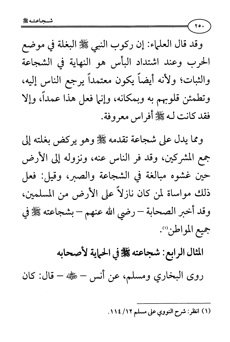 ومما يدل على شجاعة تقدمه صلى الله عليه وسلم وهو يركض بغلته إلى جمع المشركين، وقد فر الناس عنه، ونزوله إلى الأرض حين غشوه مبالغة في الشجاعة والصبر، وقيل: فعل ذلك مواساة لمن كان نازلًا على الأرض من المسلمين، وقد أخبر الصحابة - رضي الله عنهم - بشجاعته صلى الله عليه وسلم في جميع المواطن (¬1).