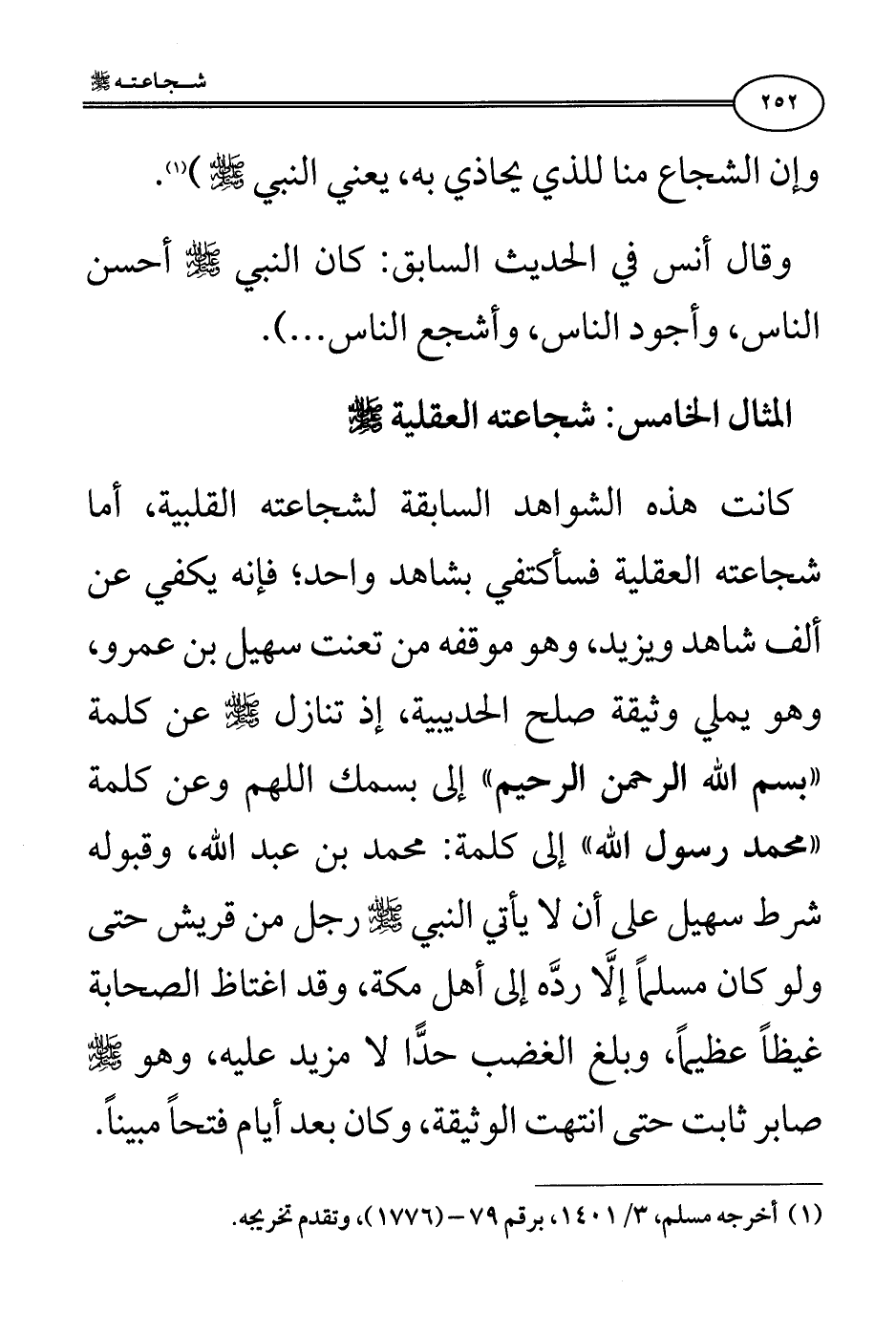 المثال الخامس: شجاعته العقلية صلى الله عليه وسلم: كانت هذه الشواهد السابقة لشجاعته القلبية، أما شجاعته العقلية فسأكتفي بشاهد واحد؛ فإنه يكفي عن ألف شاهد ويزيد، وهو موقفه من تعنت سهيل بن عمرو، وهو يملي وثيقة صلح الحديبية، إذ تنازل صلى الله عليه وسلم عن كلمة "بسم الله الرحمن الرحيم" إلى باسمك اللهم وعن كلمة " محمد رسول الله" إلى كلمة: محمد بن عبد الله، وقبوله شرط سهيل على أن لا يأتي النبي صلى الله عليه وسلم رجل من قريش حتى ولو كان مسلمًا إلَّا ردَّه إلى أهل مكة، وقد اغتاظ الصحابة غيظًا عظيمًا، وبلغ الغضب حدًّا لا مزيد عليه، وهو صلى الله عليه وسلم صابر ثابت حتى انتهت الوثيقة، وكان بعد أيام فتحًا مبينًا.