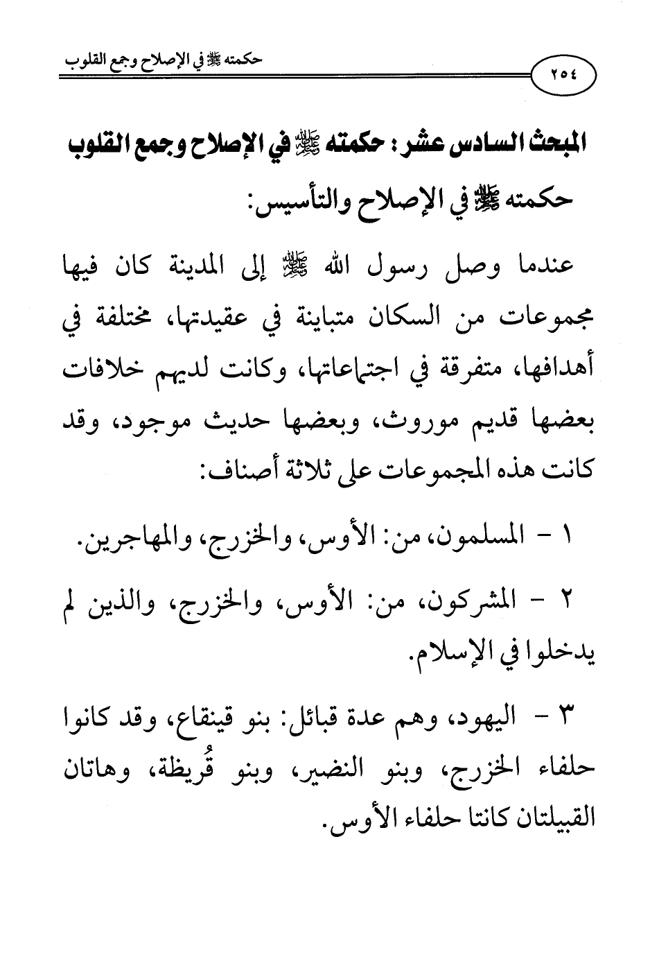 حكمته صلى الله عليه وسلم في الإصلاح والتأسيس: عندما وصل رسول الله صلى الله عليه وسلم إلى المدينة كان فيها مجموعات من السكان متباينة في عقيدتها، مختلفة في أهدافها، متفرقة في اجتماعاتها، وكانت لديهم خلافات بعضها قديم موروث، وبعضها حديث موجود، وقد كانت هذه المجموعات على ثلاثة أصناف: