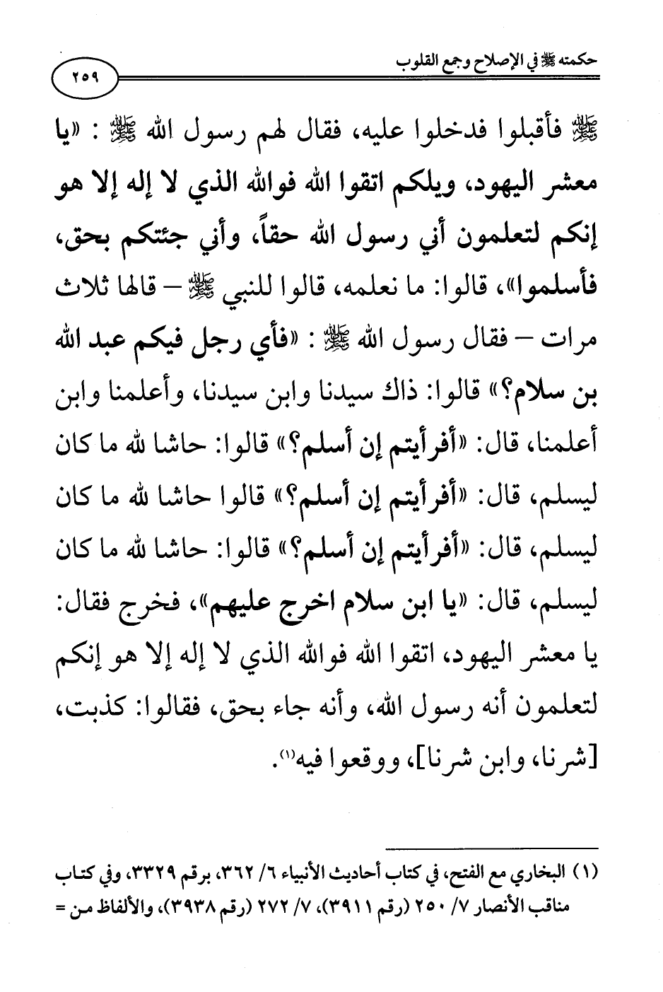 صلى الله عليه وسلم فأقبلوا فدخلوا عليه، فقال لهم رسول الله صلى الله عليه وسلم: "يا معشر اليهود، ويلكم اتقوا الله فوالله الذي لا إله إلا هو إنكم لتعلمون أني رسول الله حقًا، وأني جئتكم بحق، فأسلموا"، قالوا: ما نعلمه، قالوا للنبي صلى الله عليه وسلم - قالها ثلاث مرات - فقال رسول الله صلى الله عليه وسلم: "فأي رجل فيكم عبد الله بن سلام؟ " قالوا: ذاك سيدنا وابن سيدنا، وأعلمنا وابن أعلمنا، قال: "أفرأيتم إن أسلم؟ " قالوا: حاشا لله ما كان ليسلم، قال: "أفرأيتم إن أسلم؟ " قالوا حاشا لله ما كان ليسلم، قال: "أفرأيتم إن أسلم؟ " قالوا: حاشا لله ما كان ليسلم، قال: "يا ابن سلام اخرج عليهم"، فخرج فقال: يا معشر اليهود، اتقوا الله فوالله الذي لا إله إلا هو إنكم لتعلمون أنه رسول الله، وأنه جاء بحق، فقالوا: كذبت، [شرنا، وابن شرنا]، ووقعوا فيه» (¬1).