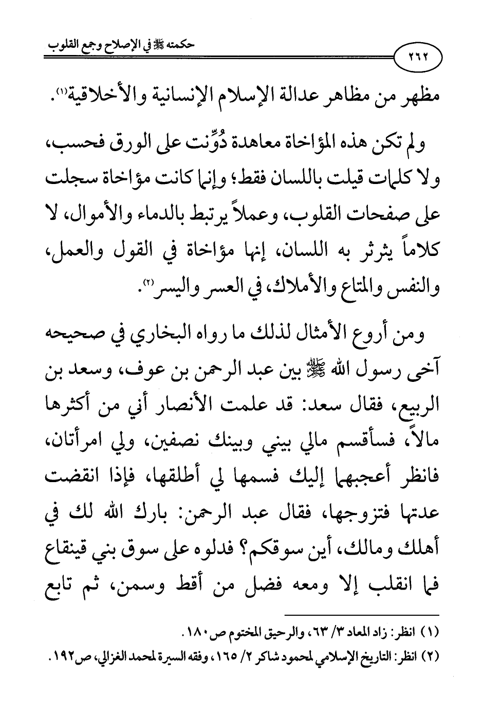 ولم تكن هذه المؤاخاة معاهدة دُوِّنت على الورق فحسب، ولا كلمات قيلت باللسان فقط؛ وإنما كانت مؤاخاة سجلت على صفحات القلوب، وعملًا يرتبط بالدماء والأموال، لا كلامًا يثرثر به اللسان، إنها مؤاخاة في القول والعمل، والنفس والمتاع والأملاك، في العسر واليسر (¬2).