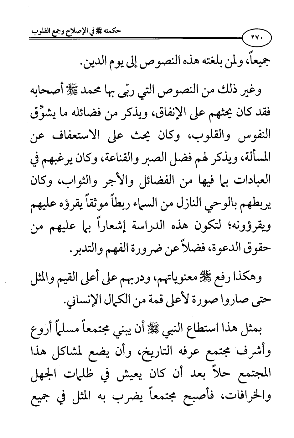 وغير ذلك من النصوص التي ربَّى بها محمد صلى الله عليه وسلم أصحابه فقد كان يحثهم على الإنفاق، ويذكر من فضائله ما يشوِّق النفوس والقلوب، وكان يحث على الاستعفاف عن المسألة، ويذكر لهم فضل الصبر والقناعة، وكان يرغبهم في العبادات بما فيها من الفضائل والأجر والثواب، وكان يربطهم بالوحي النازل من السماء ربطًا موثقًا يقرؤه عليهم ويقرؤونه؛ لتكون هذه الدراسة إشعارًا بما عليهم من حقوق الدعوة، فضلًا عن ضرورة الفهم والتدبر.