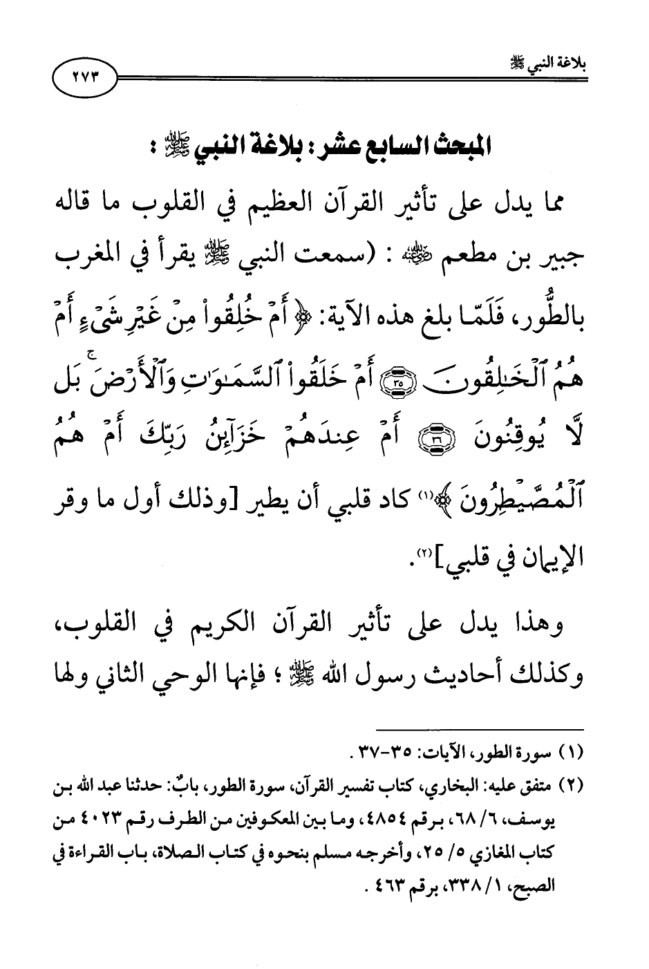 (¬1) متفق عليه: البخاري، كتاب تفسير القرآن، سورة الطور، بابٌ: حدثنا عبد الله بن يوسف، 6/ 68، برقم 4854، وما بين المعكوفين من الطرف رقم 4023 من كتاب المغازي 5/ 25، وأخرجه مسلم بنحوه في كتاب الصلاة، باب القراءة في الصبح، 1/ 338، برقم 463.