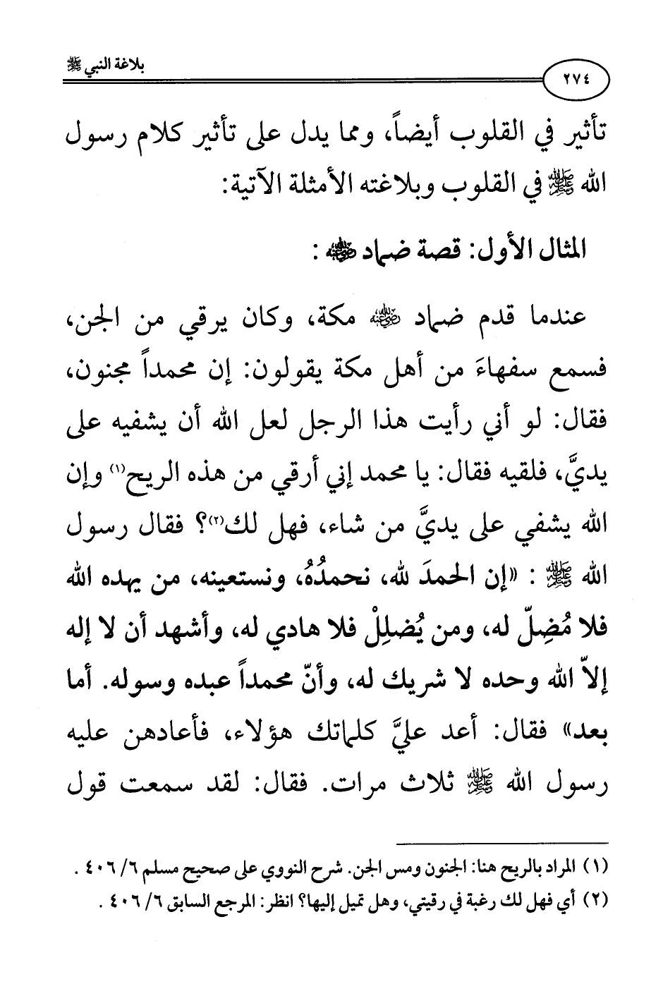 المثال الأول: قصة ضماد رضي الله عنه: «عندما قدم ضماد رضي الله عنه مكة، وكان يرقي من الجن، فسمع سفهاءَ من أهل مكة يقولون: إن محمدًا مجنون، فقال: لو أني رأيت هذا الرجل لعل الله أن يشفيه على يديَّ، فلقيه فقال: يا محمد إني أرقي من هذه الريح (¬1) وإن الله يشفي على يديَّ من شاء، فهل لك (¬2)؟ فقال رسول الله صلى الله عليه وسلم: إن الحمدَ لله، نحمدُهُ، ونستعينه، من يهده الله فلا مُضِلَّ له، ومن يُضلِلْ فلا هادي له، وأشهد أن لا إله إلاَّ الله وحده لا شريك له، وأنَّ محمدًا عبده وسوله. أما بعد، فقال: أعد عليَّ كلماتك هؤلاء، فأعادهن عليه رسول الله صلى الله عليه وسلم ثلاث مرات. فقال: لقد سمعت قول
