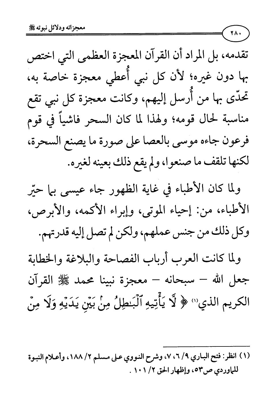 ولما كانت العرب أرباب الفصاحة والبلاغة والخطابة جعل الله - سبحانه - معجزة نبينا محمد صلى الله عليه وسلم القرآن الكريم الذي (¬1) {لَا يَأْتِيهِ الْبَاطِلُ مِنْ بَيْنِ يَدَيْهِ وَلَا مِنْ خَلْفِهِ تَنْزِيلٌ مِنْ حَكِيمٍ حَمِيدٍ} [فصلت: 42].