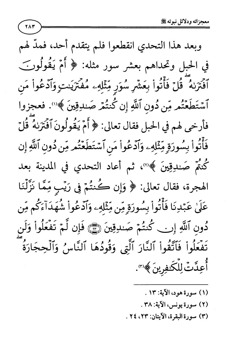 وبعد هذا التحدي انقطعوا فلم يتقدم أحد، فمدَّ لهم في الحبل وتحداهم بعشر سور مثله: {أَمْ يَقُولُونَ افْتَرَاهُ قُلْ فَأْتُوا بِسُورَةٍ مِثْلِهِ وَادْعُوا مَنِ اسْتَطَعْتُمْ مِنْ دُونِ اللَّهِ إِنْ كُنْتُمْ صَادِقِينَ} [يونس: 38]، فعجزوا فأرخى لهم في الحبل فقال تعالى: {أَمْ يَقُولُونَ افْتَرَاهُ قُلْ فَأْتُوا بِسُورَةٍ مِثْلِهِ وَادْعُوا مَنِ اسْتَطَعْتُمْ مِنْ دُونِ اللَّهِ إِنْ كُنْتُمْ صَادِقِينَ} [يونس: 38]، ثم أعاد التحدي في المدينة بعد الهجرة، فقال تعالى: {وَإِنْ كُنْتُمْ فِي رَيْبٍ مِمَّا نَزَّلْنَا عَلَى عَبْدِنَا فَأْتُوا بِسُورَةٍ مِنْ مِثْلِهِ وَادْعُوا شُهَدَاءَكُمْ مِنْ دُونِ اللَّهِ إِنْ كُنْتُمْ صَادِقِينَ - فَإِنْ لَمْ تَفْعَلُوا وَلَنْ تَفْعَلُوا فَاتَّقُوا النَّارَ الَّتِي وَقُودُهَا النَّاسُ وَالْحِجَارَةُ أُعِدَّتْ لِلْكَافِرِينَ} [البقرة: 23 - 24].