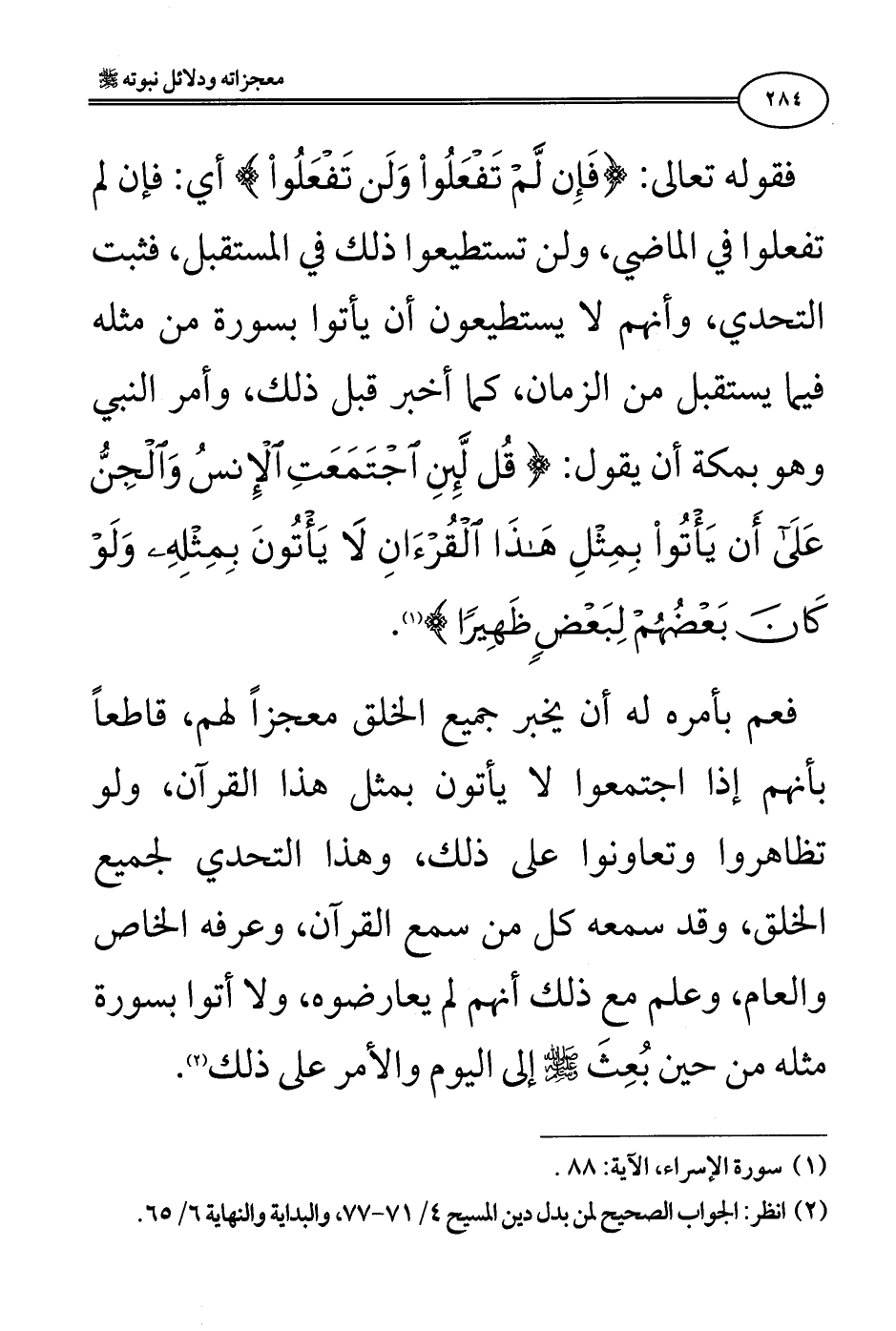 فقوله تعالى: {فَإِنْ لَمْ تَفْعَلُوا وَلَنْ تَفْعَلُوا} [البقرة: 24] أي: فإن لم تفعلوا في الماضي، ولن تستطيعوا ذلك في المستقبل، فثبت التحدي، وأنهم لا يستطيعون أن يأتوا بسورة من مثله فيما يستقبل من الزمان، كما أخبر قبل ذلك، وأمر النبي وهو بمكة أن يقول: {قُلْ لَئِنِ اجْتَمَعَتِ الْإِنْسُ وَالْجِنُّ عَلَى أَنْ يَأْتُوا بِمِثْلِ هَذَا الْقُرْآنِ لَا يَأْتُونَ بِمِثْلِهِ وَلَوْ كَانَ بَعْضُهُمْ لِبَعْضٍ ظَهِيرًا} [الإسراء: 88].