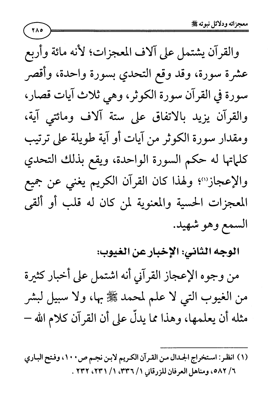 والقرآن يشتمل على آلاف المعجزات؛ لأنه مائة وأربع عشرة سورة، وقد وقع التحدي بسورة واحدة، وأقصر سورة في القرآن سورة الكوثر، وهي ثلاث آيات قصار، والقرآن يزيد بالاتفاق على ستة آلاف ومائتي آية، ومقدار سورة الكوثر من آيات أو آية طويلة على ترتيب كلماتها له حكم السورة الواحدة، ويقع بذلك التحدي والإعجاز (¬1)؛ ولهذا كان القرآن الكريم يغني عن جميع المعجزات الحسية والمعنوية لمن كان له قلب أو ألقى السمع وهو شهيد.