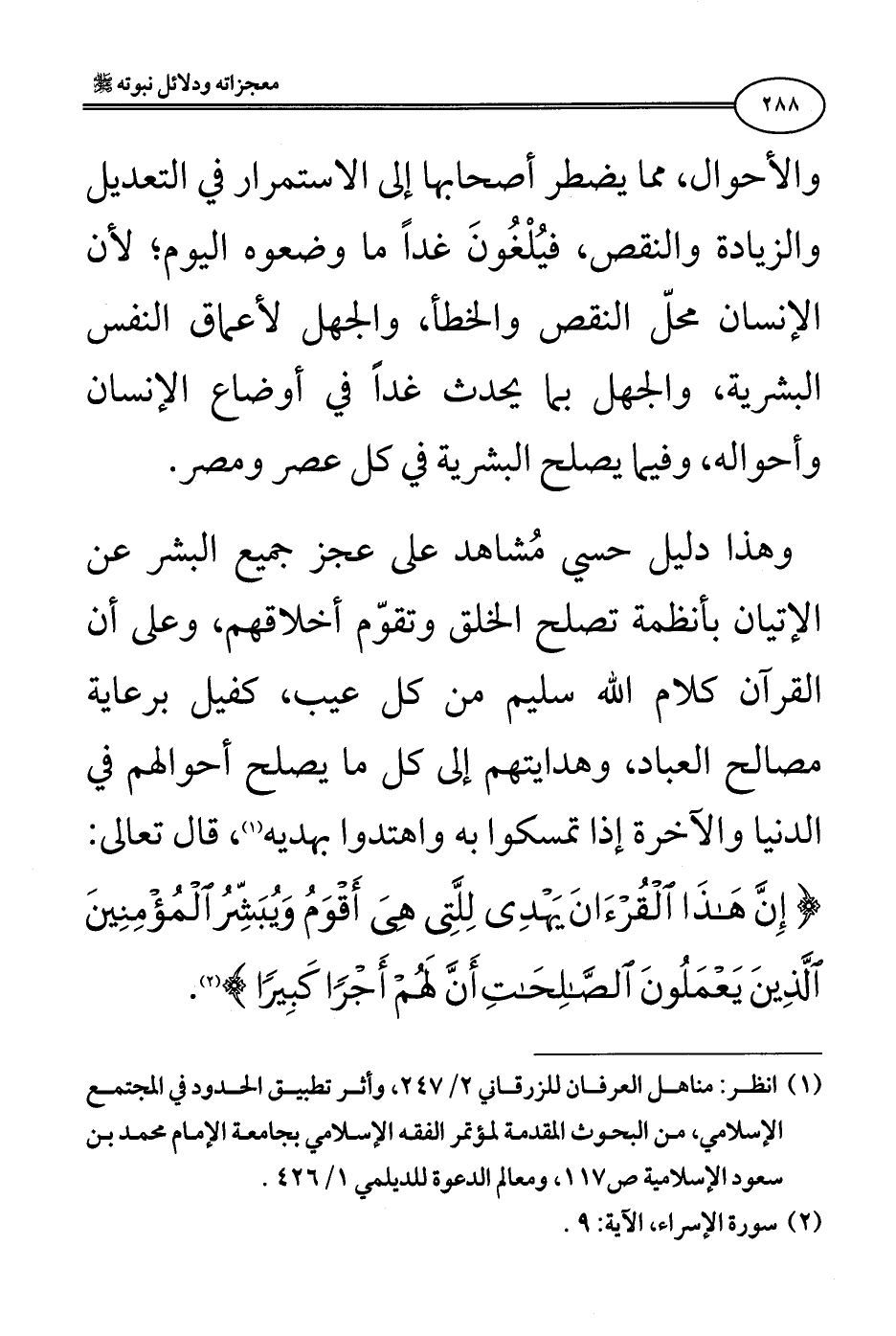 وهذا دليل حسي مُشاهد على عجز جميع البشر عن الإتيان بأنظمة تصلح الخلق وتقوِّم أخلاقهم، وعلى أن القرآن كلام الله سليم من كل عيب، كفيل برعاية مصالح العباد، وهدايتهم إلى كل ما يصلح أحوالهم في الدنيا والآخرة إذا تمسكوا به واهتدوا بهديه (¬1) قال تعالى: {إِنَّ هَذَا الْقُرْآنَ يَهْدِي لِلَّتِي هِيَ أَقْوَمُ وَيُبَشِّرُ الْمُؤْمِنِينَ الَّذِينَ يَعْمَلُونَ الصَّالِحَاتِ أَنَّ لَهُمْ أَجْرًا كَبِيرًا} [الإسراء: 9].