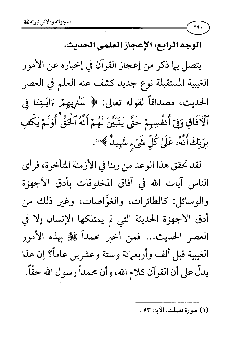الوجه الرابع: الإعجاز العلمي الحديث: يتصل بما ذكر من إعجاز القرآن في إخباره عن الأمور الغيبية المستقبلة نوع جديد كشف عنه العلم في العصر الحديث، مصداقًا لقوله تعالى: {سَنُرِيهِمْ آيَاتِنَا فِي الْآفَاقِ وَفِي أَنْفُسِهِمْ حَتَّى يَتَبَيَّنَ لَهُمْ أَنَّهُ الْحَقُّ أَوَلَمْ يَكْفِ بِرَبِّكَ أَنَّهُ عَلَى كُلِّ شَيْءٍ شَهِيدٌ} [فصلت: 53].