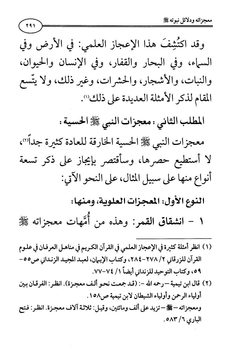 (¬2) قال ابن تيمية - رحمه الله -: (قد جمعت نحو ألف معجزة). انظر: الفرقان بين أولياء الرحمن وأولياء الشيطان لابن تيمية ص158. ومعجزاته - صلى الله عليه وسلم - تزيد على ألف ومائتين، وقيل: ثلاثة آلاف معجزة. انظر: فتح الباري 6/ 583.