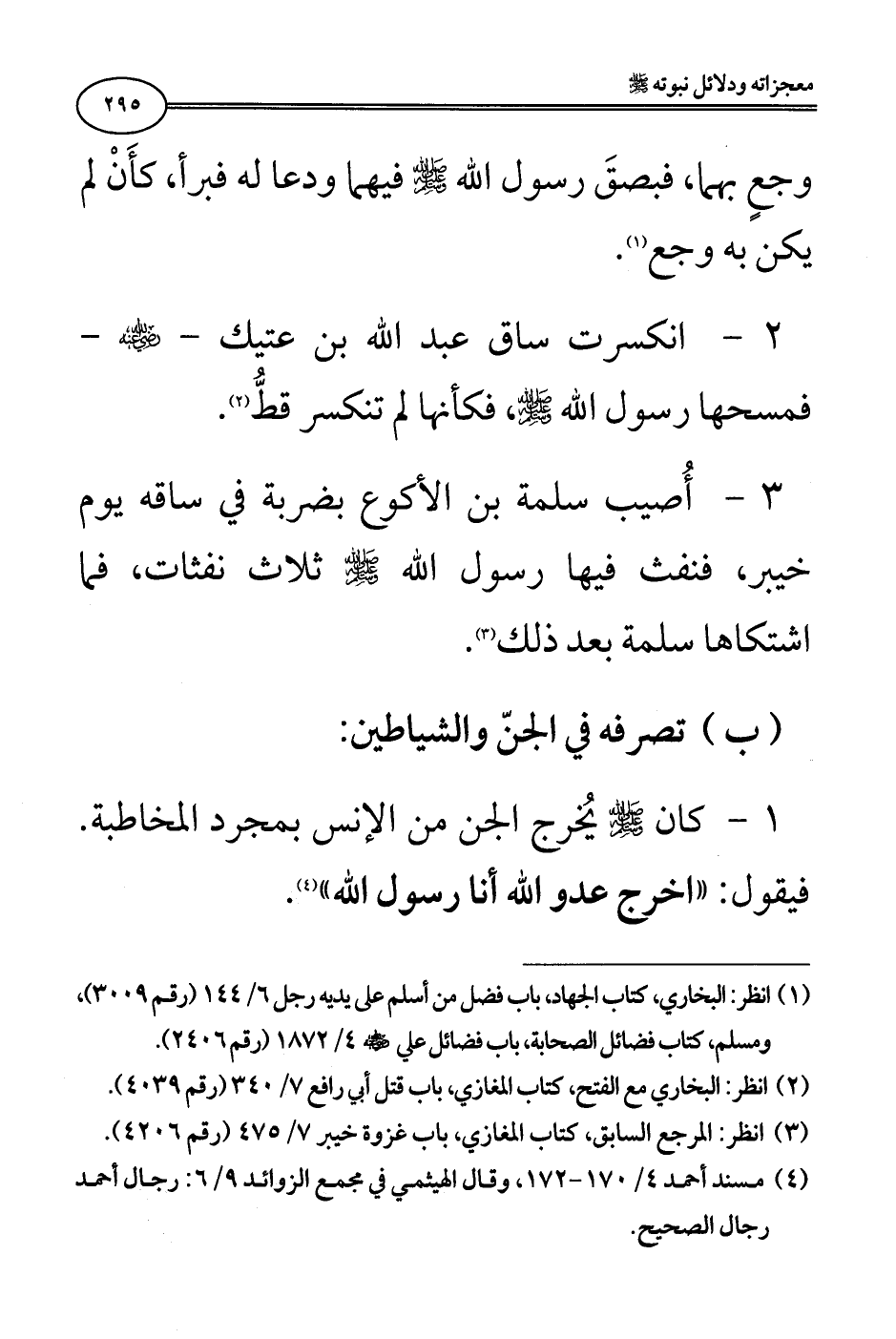 3 - «أُصيب سلمة بن الأكوع بضربة في ساقه يوم خيبر، فنفث فيها رسول الله صلى الله عليه وسلم ثلاث نفثات، فما اشتكاها سلمة بعد ذلك» (¬3).