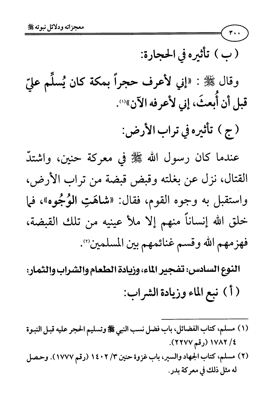 (ج) تأثيره في تراب الأرض: «عندما كان رسول الله صلى الله عليه وسلم في معركة حنين، واشتدَّ القتال، نزل عن بغلته وقبض قبضة من تراب الأرض، واستقبل به وجوه القوم، فقال: "شاهَتِ الوُجُوه"، فما خلق الله إنسانًا منهم إلا ملأ عينيه من تلك القبضة، فهزمهم الله وقسم غنائمهم بين المسلمين» (¬2).