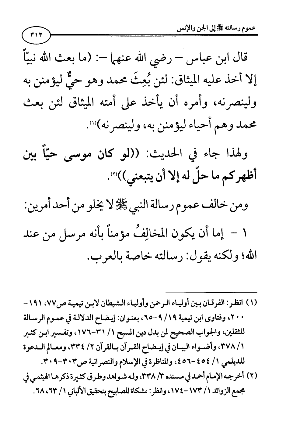 (¬1) انظر: الفرقان بين أولياء الرحمن وأولياء الشيطان لابن تيمية ص77، 191 - 200، وفتاوى ابن تيمية 19/ 9 - 65، بعنوان: إيضاح الدلالة في عموم الرسالة للثقلين، والجواب الصحيح لمن بدل دين المسيح 1/ 31 - 176، وتفسير ابن كثير 1/ 378، وأضواء البيان في إيضاح القرآن بالقرآن 2/ 334، ومعالم الدعوة للديلمي 1/ 454 - 456، والمناظرة في الإسلام والنصرانية ص303 - 309.