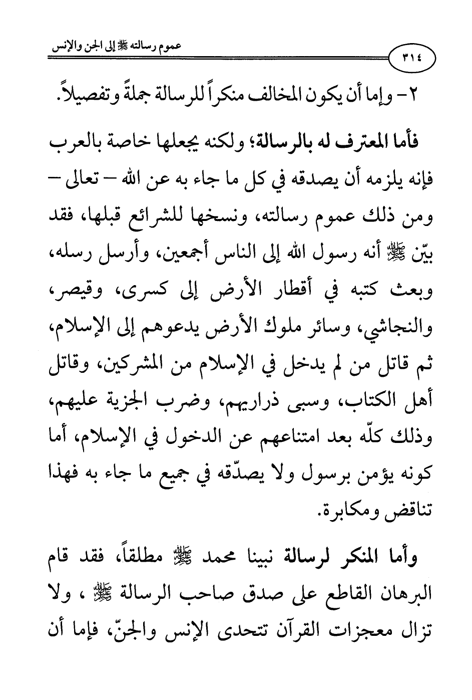 فأما المعترف له بالرسالة؛ ولكنه يجعلها خاصة بالعرب فإنه يلزمه أن يصدقه في كل ما جاء به عن الله - تعالى - ومن ذلك عموم رسالته، ونسخها للشرائع قبلها، فقد بيَّن صلى الله عليه وسلم أنه رسول الله إلى الناس أجمعين، وأرسل رسله، وبعث كتبه في أقطار الأرض إلى كسرى، وقيصر، والنجاشي، وسائر ملوك الأرض يدعوهم إلى الإسلام، ثم قاتل من لم يدخل في الإسلام من المشركين، وقاتل أهل الكتاب، وسبى ذراريهم، وضرب الجزية عليهم، وذلك كلُّه بعد امتناعهم عن الدخول في الإسلام، أما كونه يؤمن برسول ولا يصدُّقه في جميع ما جاء به فهذا تناقض ومكابرة.