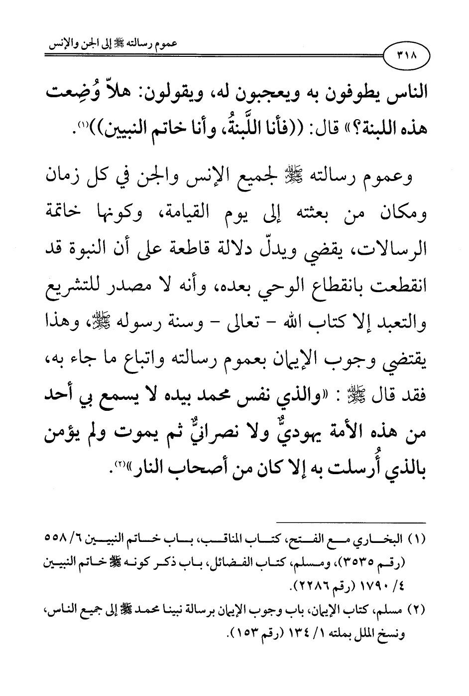 (¬2) مسلم، كتاب الإيمان، باب وجوب الإيمان برسالة نبينا محمد - صلى الله عليه وسلم - إلى جميع الناس، ونسخ الملل بملته 1/ 134 (رقم 153).