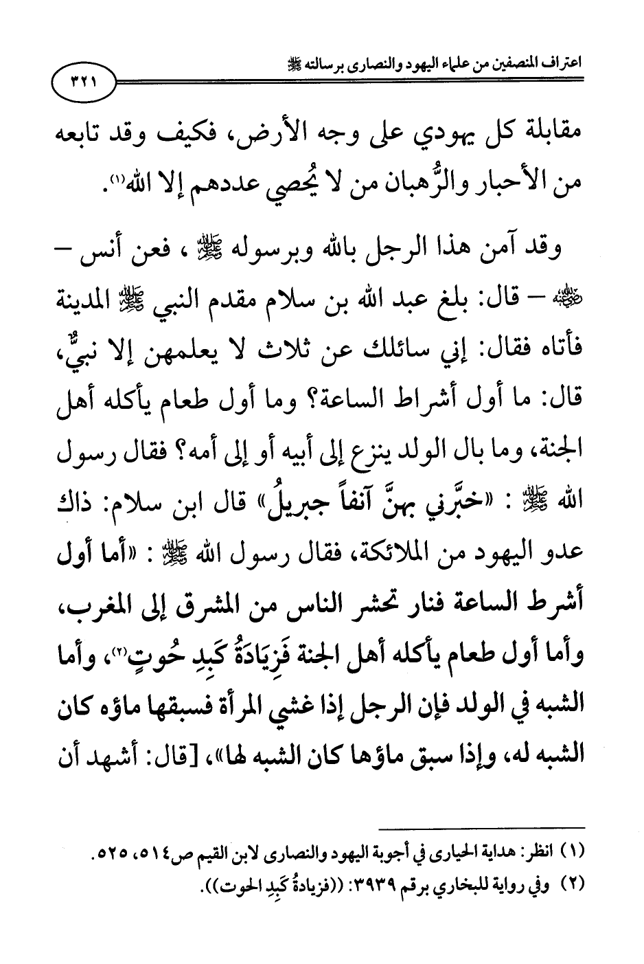 وقد آمن هذا الرجل بالله وبرسوله صلى الله عليه وسلم، فعن أنس - رضي الله عنه - قال: «بلغ عبد الله بن سلام مقدم النبي صلى الله عليه وسلم المدينة فأتاه فقال: إني سائلك عن ثلاث لا يعلمهن إلا نبيٌّ، قال: ما أول أشراط الساعة؟ وما أول طعام يأكله أهل الجنة، وما بال الولد ينزع إلى أبيه أو إلى أمه؟ فقال رسول الله صلى الله عليه وسلم: "خبَّرني بهنَّ آنفًا جبريلُ" قال ابن سلام: ذاك عدو اليهود من الملائكة، فقال رسول الله صلى الله عليه وسلم: "أما أول أشرط الساعة فنار تحشر الناس من المشرق إلى المغرب، وأما أول طعام يأكله أهل الجنة فَزِيَادَةُ كَبِدِ حُوتٍ (¬2)