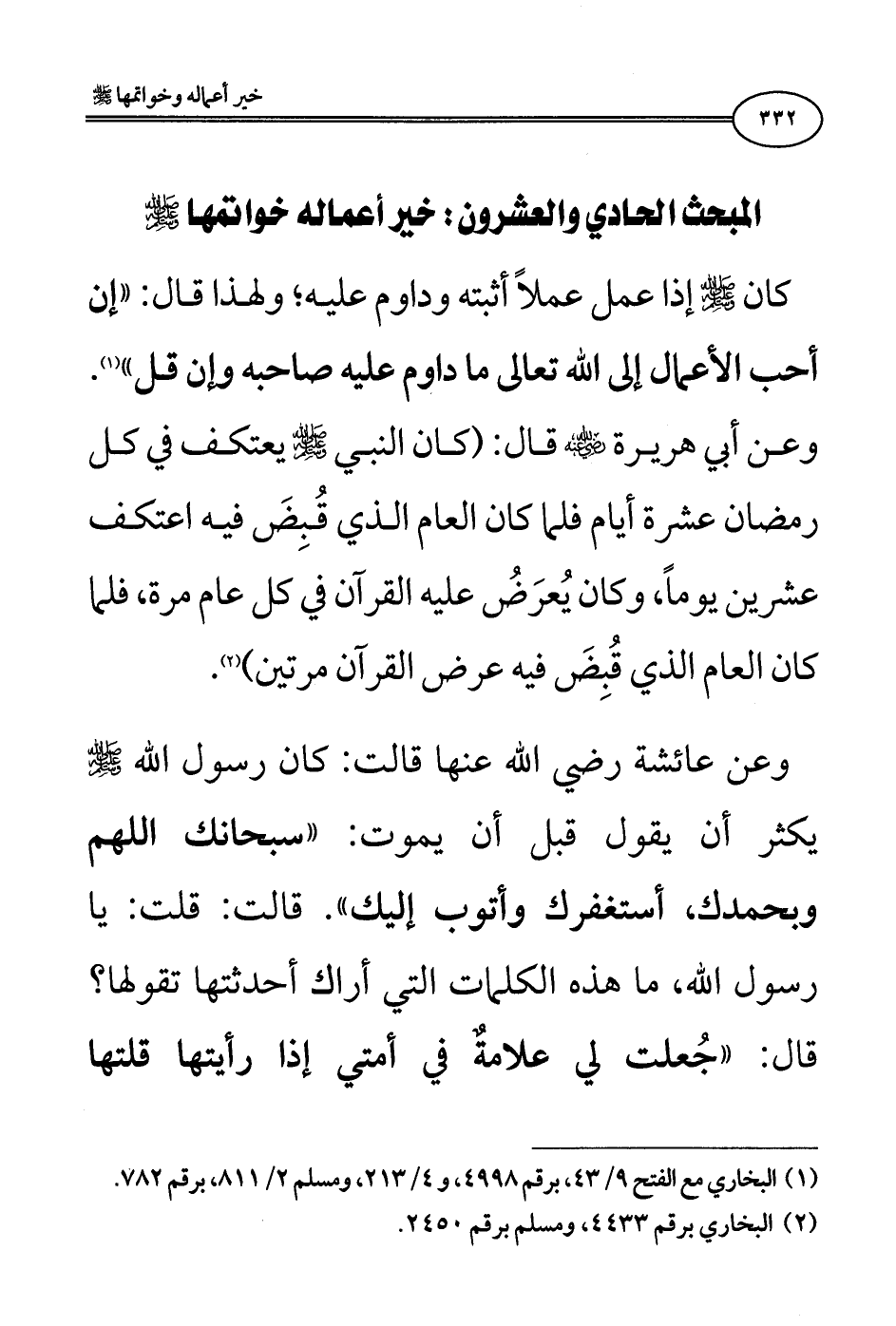 كان صلى الله عليه وسلم إذا عمل عملًا أثبته وداوم عليه؛ ولهذا قال: «إن أحب الأعمال إلى الله تعالى ما داوم عليه صاحبه وإن قل» (¬1). وعن أبي هريرة رضي الله عنه قال: «كان النبي صلى الله عليه وسلم يعتكف في كل رمضان عشرة أيام فلما كان العام الذي قُبِضَ فيه اعتكف عشرين يومًا، وكان يُعرَضُ عليه القرآن في كل عام مرة، فلما كان العام الذي قُبِضَ فيه عرض القرآن مرتين» (¬2).